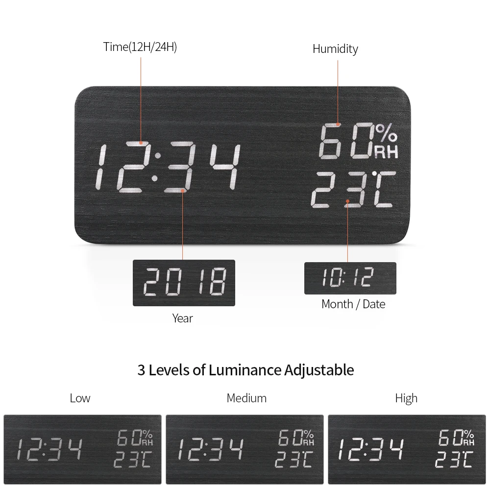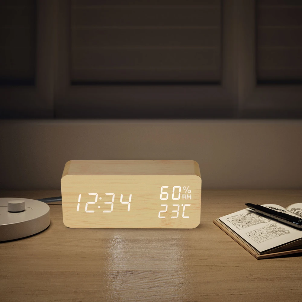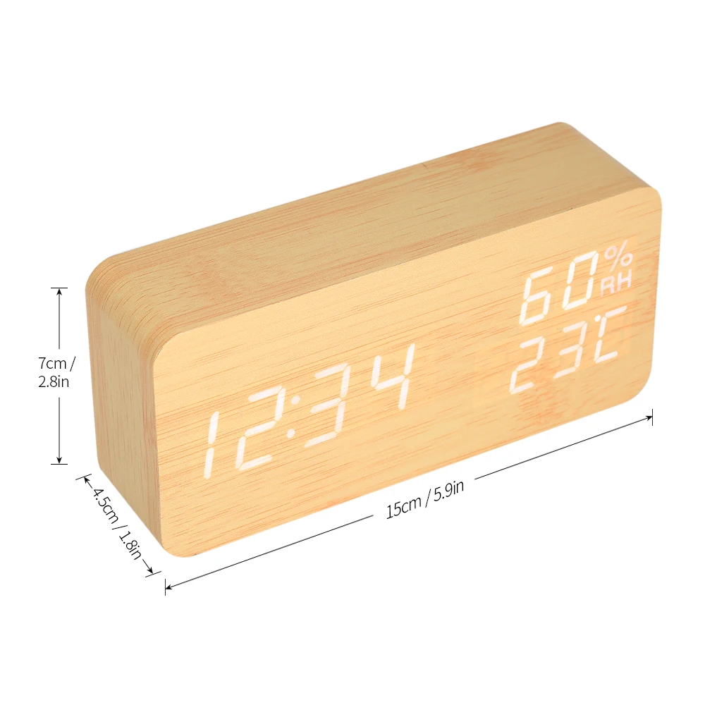 Элегантный Деревянный Будильник, с четким светодиодный дисплеем, идеально подходит для использования дома и в офисе. Он имеет 2 режима дисплея и 3 настройки будильника. USB или аккумулятор, удобно использовать. Кроме того, он имеет функцию звукового управления, которая является энергосберегающей и не будет беспокоить вас во время сна.