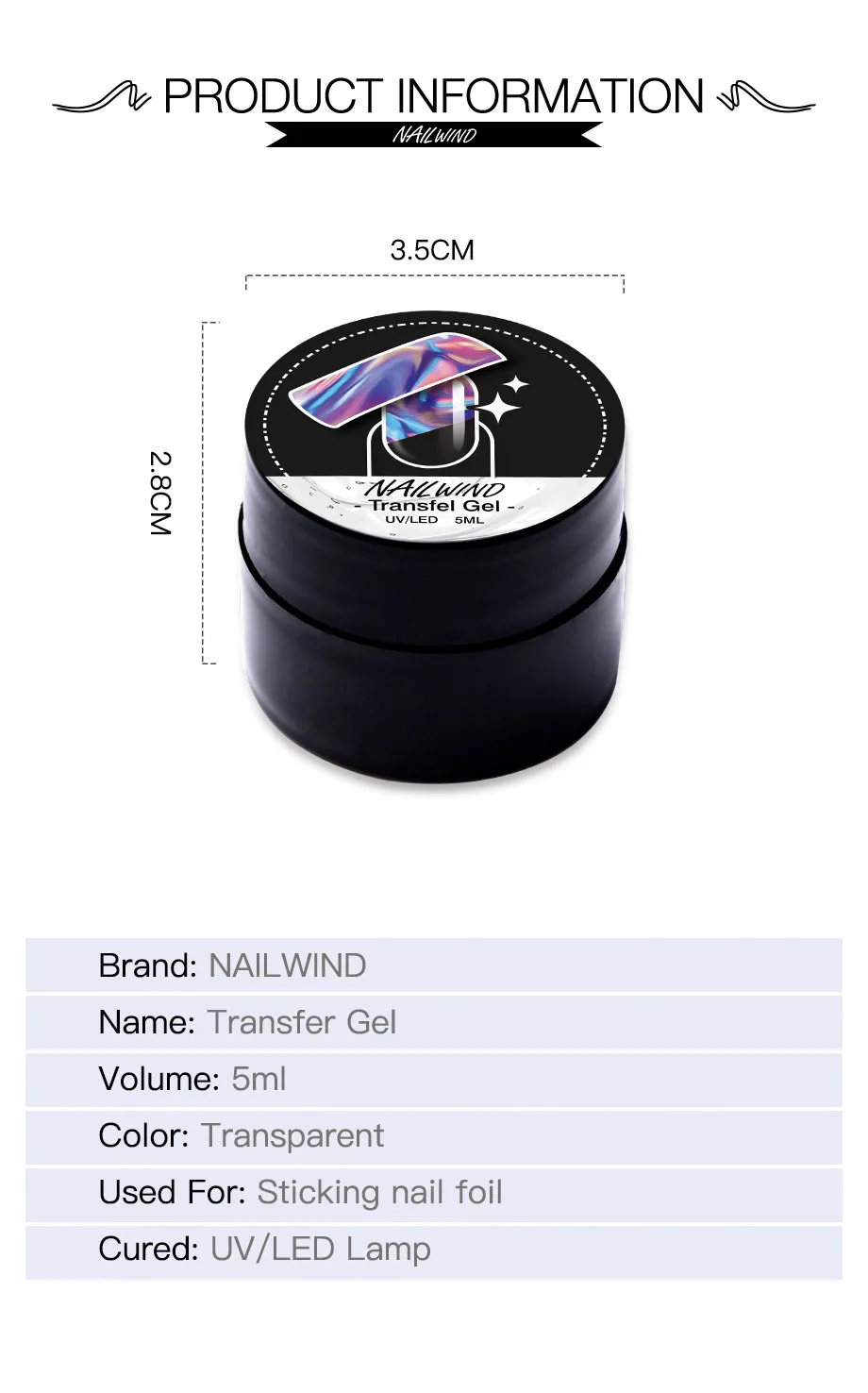 Технические характеристики изделия: бренд: Nailwind Название: переносный гель объем: 5 мл цвет: прозрачный используется для: приклеивания фольги для ногтей отверждаемый: УФ/Светодиодная лампа