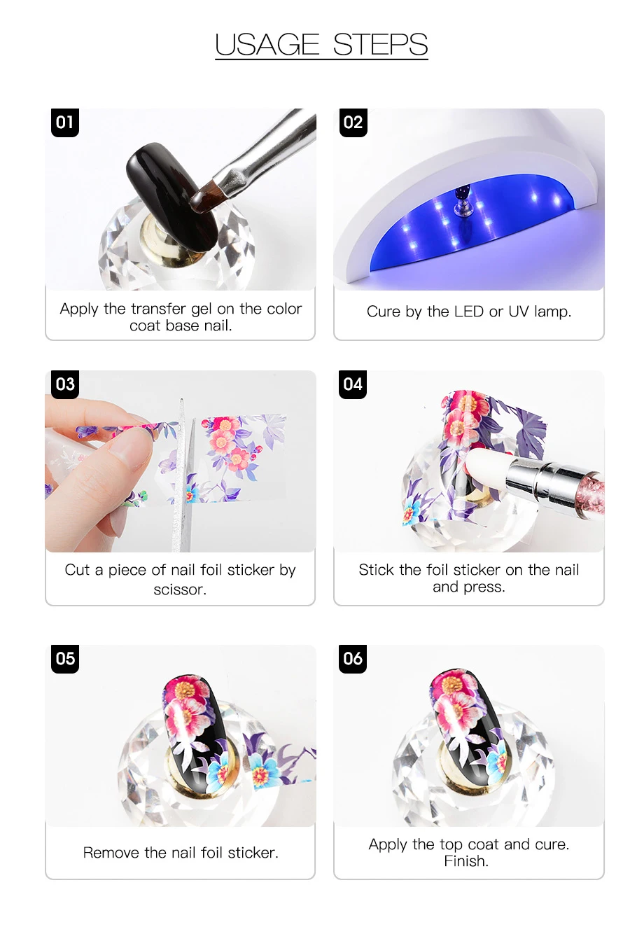 1. Нанесите переводной гель на ногтевое покрытие с помощью цветного покрытия. 2. Светодиодная или УФ-лампа для лечения. 3. Нарежьте наклейку из фольги для ногтей ножницами. 4. Наклейте наклейку из фольги на гвоздь и нажмите. 5. Удалите наклейку из фольги для ногтей. 6. Нанесите верхнее пальто и закрепите. Отделки.