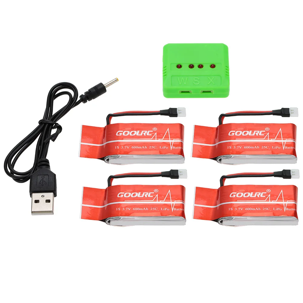 GoolRC 4 шт. 3,7 в 600 мАч 25C Lipo аккумулятор и 4-портовый зарядный набор для Syma X5C X5SC X5SW H5C Q7 Quadcopter QX80 QX90 QX95 Drone. Хороший выбор, чтобы вы наслаждались более долгими и летящими радостями.
