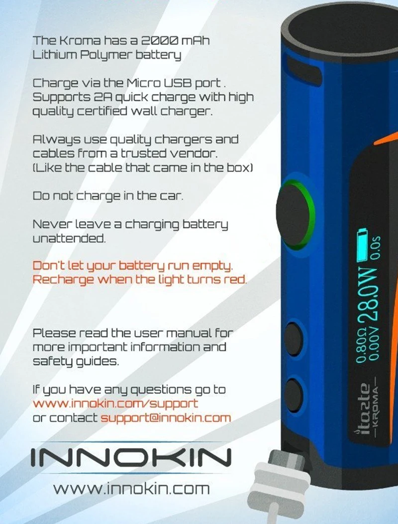 Система Innokin Kroma Vape-75 Вт мощности контроля температуры в ультракомпактном корпусе диаметром 72 мм, обеспечивающем максимальное сцепление. Система Innokin Kroma Vape работает от плавной точности 75 ватт этонового микросхем контроля температуры (SS316L, Ni200, titanium) с защитой от сухого попадания.