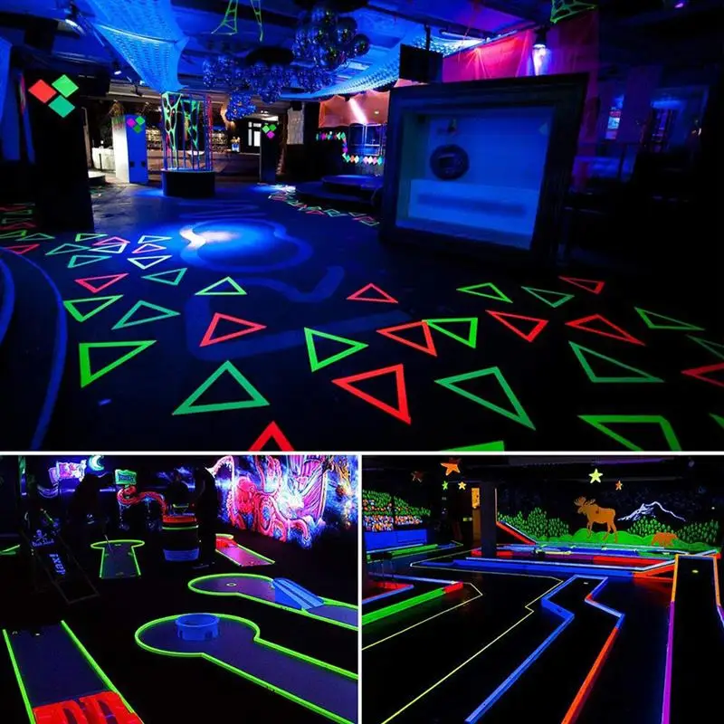 Лента является идеальным источником питания для детей и взрослых черных световых вечеринок, улучшает ваши праздничные украшения, вы также можете украсить стены, полы, окна, танцпол, мебель, бильярдный стол, торт, изображение, а также можно прикрепить к одежде, маркировать предметы, Может использоваться как светящаяся в темноте лента для сцены.