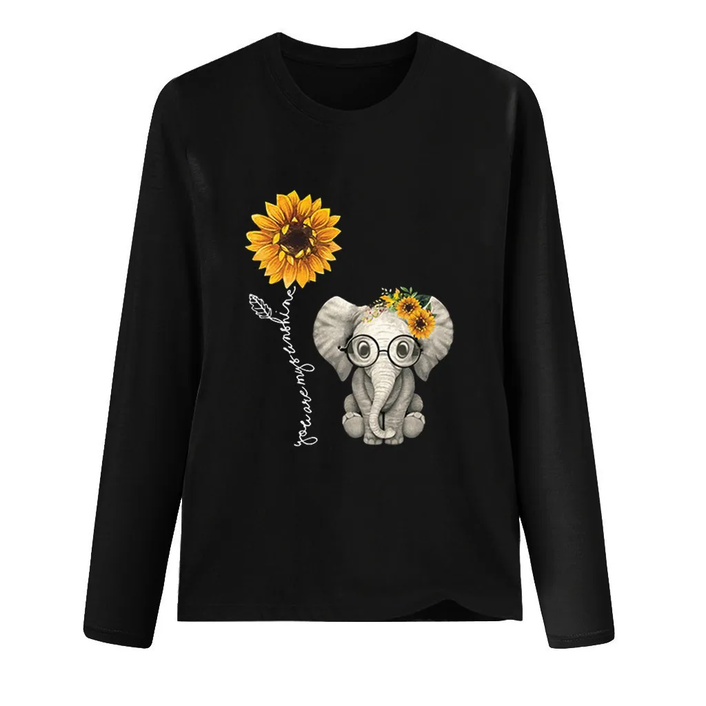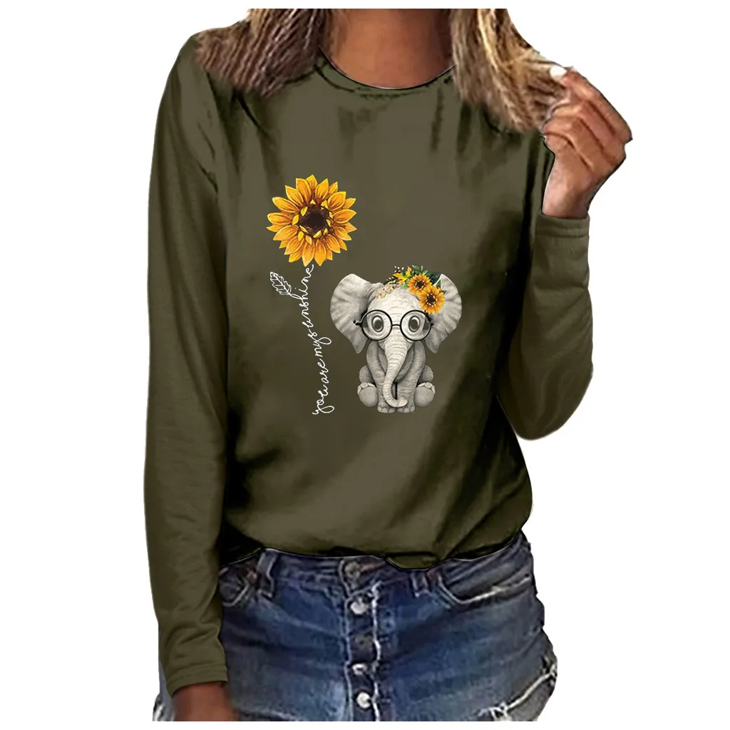 Женская футболка с длинным рукавом и круглым вырезом, с принтом в виде слона подсолнуха, футболки размера плюс, пуловер, женская футболка, camisa feminina