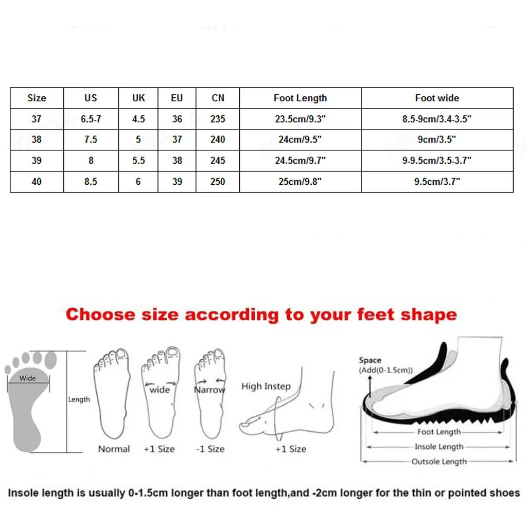 Size US UK EU CN Foot Length Foot wide 37 6.5-7 4.5 36 235 23.5cm/9.3" 8.5-9cm/3.4-3.5" 38 7.5 5 37 240 24cm/9.5" 9cm/3.5" 39 8 5.5 38 245 24.5cm/9.7" 9-9.5cm/3.5-3.7" 40 8.5 6 39 250 25cm/9.8" 9.5cm/3.7"