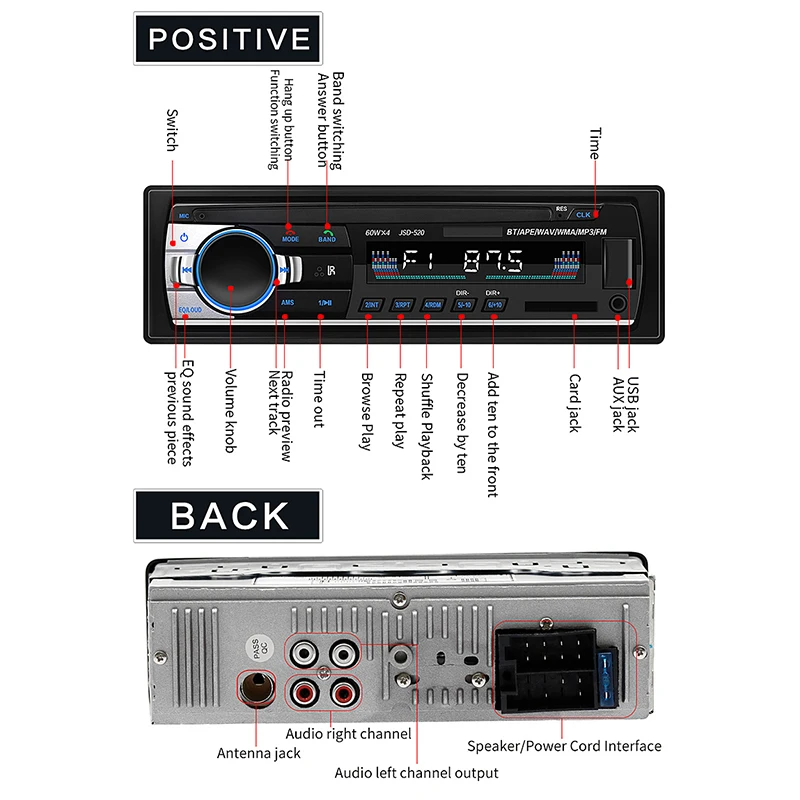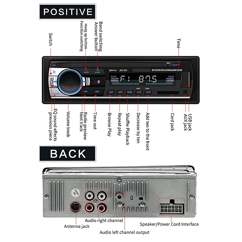 -- Воспроизведение: Поддержка u-диска и sd-карты для воспроизведения, вам нужно только вставить u-диск или sd-карту в интерфейс машины для воспроизведения музыки.