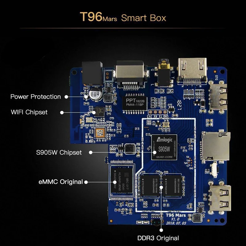 Процессор: Amlogic S905W четырехъядерный ARM Cortex A53/2 ГГц; GPU: Penta-core Mali-450MP GPU/750 МГц, ram: DDR3 2 Гб; rom: Встроенный eMMC Flash 8 Гб; Расширение памяти: mini SD карта (максимальная поддержка 32 ГБ)