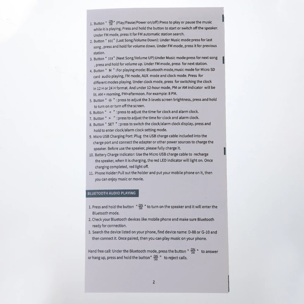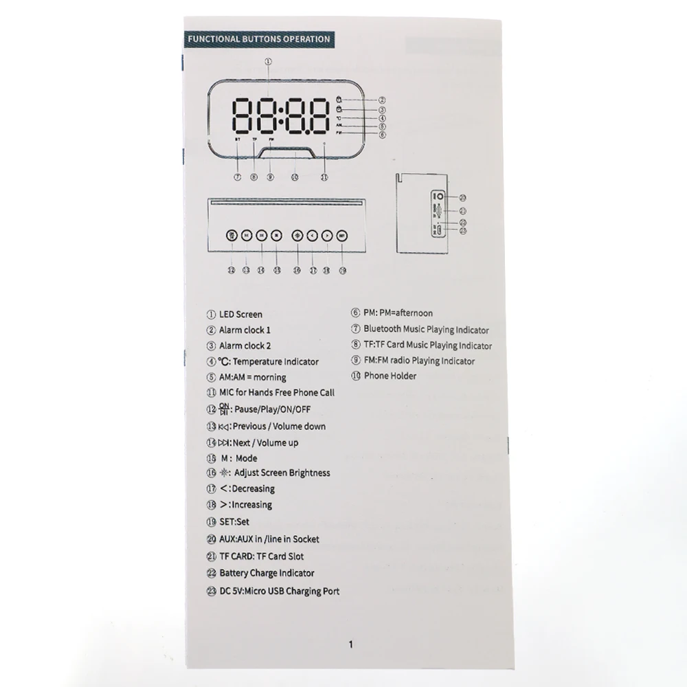 Держатель мобильного телефона, 3 уровня регулировки яркости, функция голосового вызоваBluetoothAUXTF три режима воспроизведения, 360 градусов стерео бас, функция fm-радиоЧасыДвойной будильникТемпературный дисплейЖК-дисплей зеркального отображения