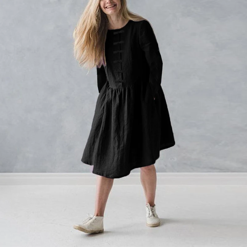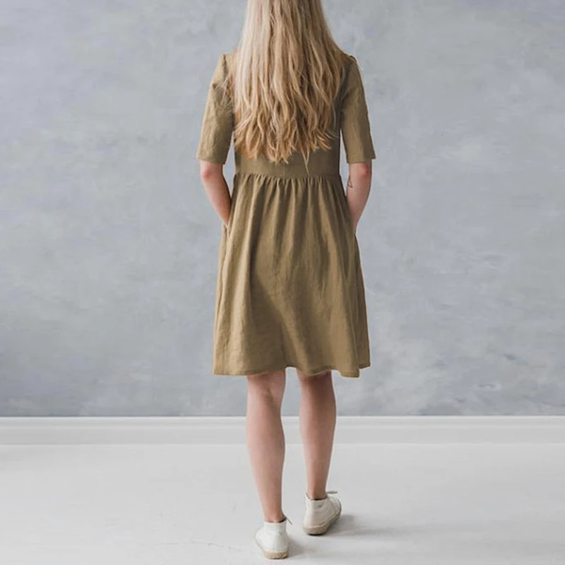 Описание товара: женское платье с круглым вырезом и короткими рукавами и карманами на пуговицах
