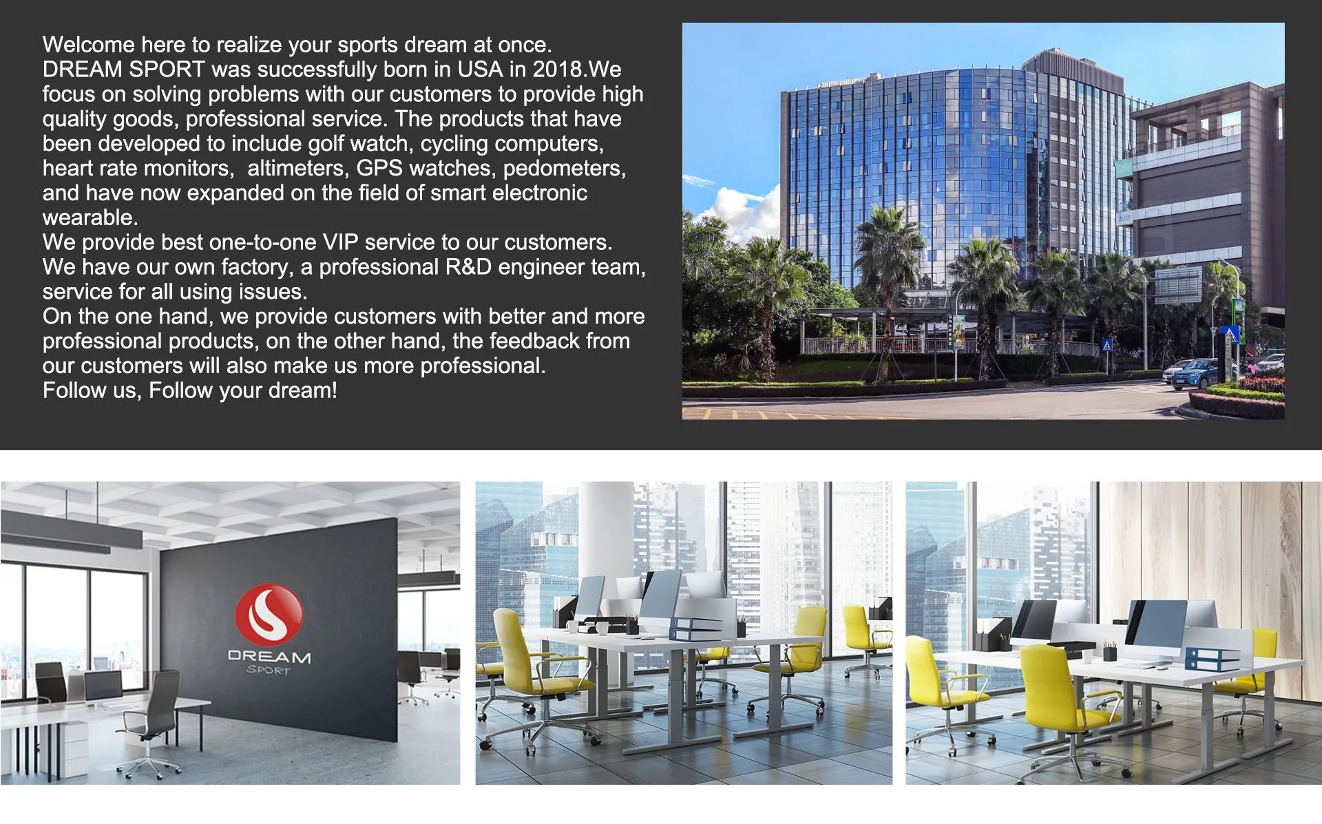 DreamSport специализируется на спортивном оборудовании и электронных продуктах в течение многих лет, особенно на велосипеде, у нас есть богатый опыт и возможности исследований и разработок. Все продукты DreamSport были протестированы нашей командой перед тем, как быть переданным вам. Наша простая цель-предоставить вам хороший опыт в наших товарах, и мы надеемся, что это поможет вам достичь цели.