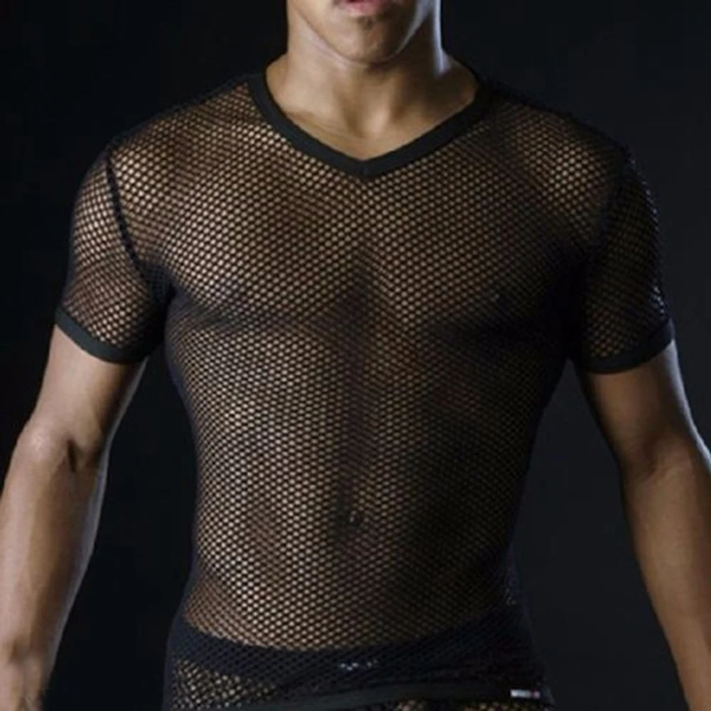 Горячие сексуальные мужские повседневные стильные рубашки из сетки. Круглый вырез горловины. Короткий рукав.