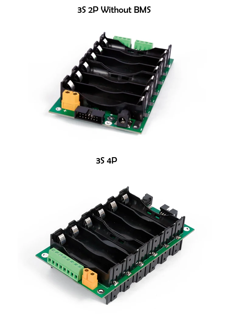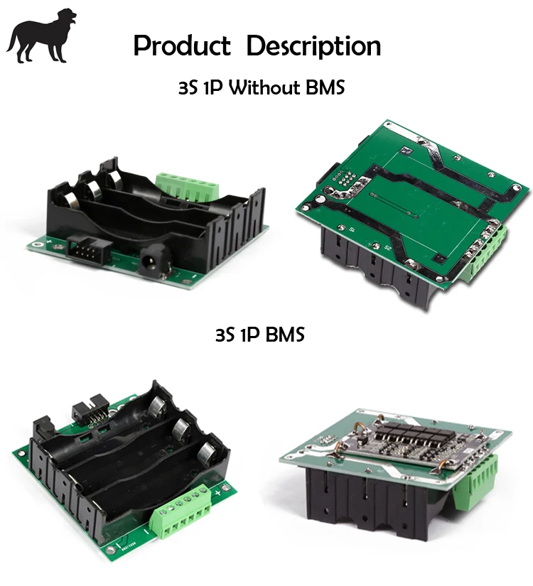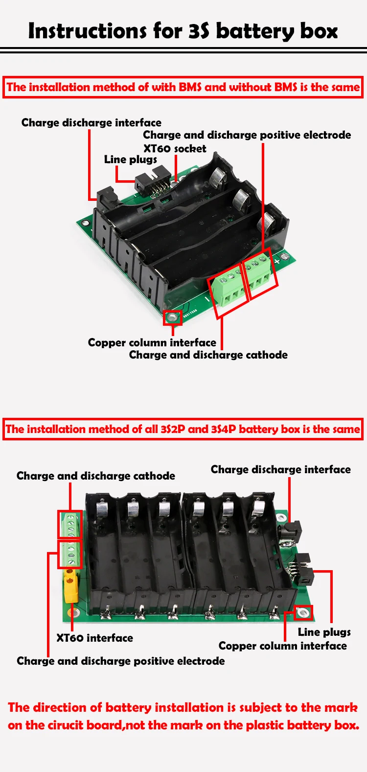 Параметры продукта 3S 1 pбез BMS 3S 1P с BMS Вес: 55 г Вес: 70 г Размер: 79*89*24 мм Размер: 79*89*23 мм Напряжение: 12,6 V Напряжение: 12,6 V 3S2P без BMS 3S4P Вес: 134 г Вес: 140 г Размер: 150*85*25 Размер: 150*85*45 Напряжение: 12,6 V Напряжение: 12,6 V 3S2P 40A/80A BMS Вес: 122 г Размер: 150*85*25 Напряжение: 12,6 V На что следует обратить внимание ★★★★Пожалуйста, купите по крайней мере один BMS. Мы не Подключаем Отрицательный выход 3S без BMS (включая 3S 4P) XT60 штекер в конструкции, он должен использовать переднюю медную розетку и ленточный кабель для подключения 3S BMS для вывода. BMS может обеспечить функцию выравнивания заряда и разряда для всей системы (несколько аккумуляторных коробок) одновременно. ★3S потребности зарядки 12,6 V зарядное устройство. ★Рекомендуется, чтобы ток зарядки каждого слоя не превышал 2 А, в противном случае батарея может нагреваться (например, выберите 2A зарядное устройство только для одного слоя, И зарядное устройство 4A для двух слоев). ★Не ставьте на металлическую столешницу для использования, обратите внимание на изоляцию, не короткое замыкание. ★Аккумулятор находится на монтажной плате, все батареи имеют одинаковую поверхность. Направление установки батареи зависит от отметки на панели cirucit, а не от отметки на пластиковой аккумуляторной коробке. ★Не подключайте неправильный источник питания, печатная плата отмечена, обратите внимание на наблюдение. ★Прайс-лист-это цена печатной платы или аккумуляторной коробки.