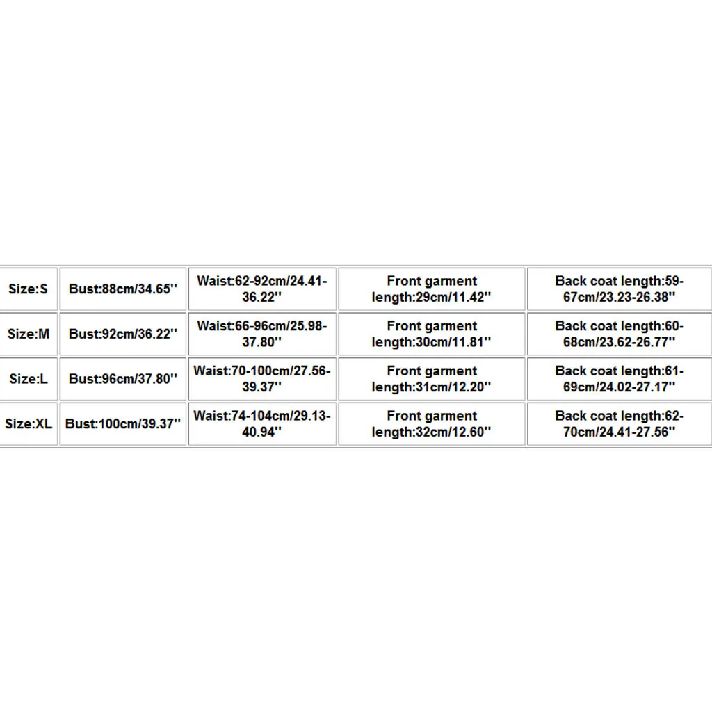 Size Bust Waist Front garment length Back coat length S 88cm/34.65'' 62-92cm/24.41-36.22'' 29cm/11.42'' 59-67cm/23.23-26.38'' M 92cm/36.22'' 66-96cm/25.98-37.80'' 30cm/11.81'' 60-68cm/23.62-26.77'' L 96cm/37.80'' 70-100cm/27.56-39.37'' 31cm/12.20'' 61-69cm/24.02-27.17'' XL 100cm/39.37'' 74-104cm/29.13-40.94'' 32cm/12.60'' 62-70cm/24.41-27.56''