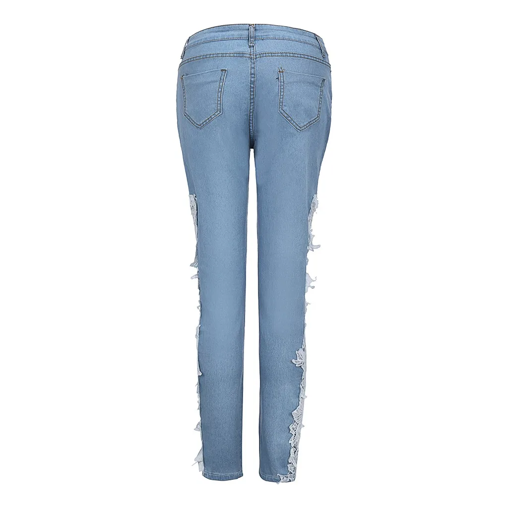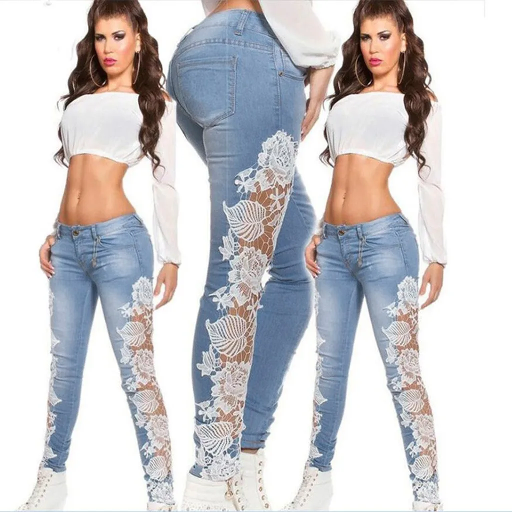 Модные женские кружевные узкие джинсы с цветочной аппликацией, узкие джинсовые брюки-карандаш