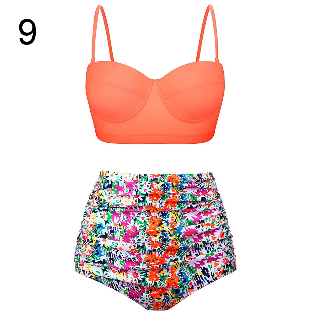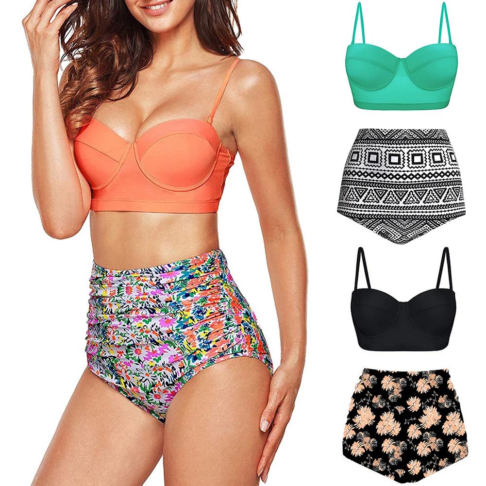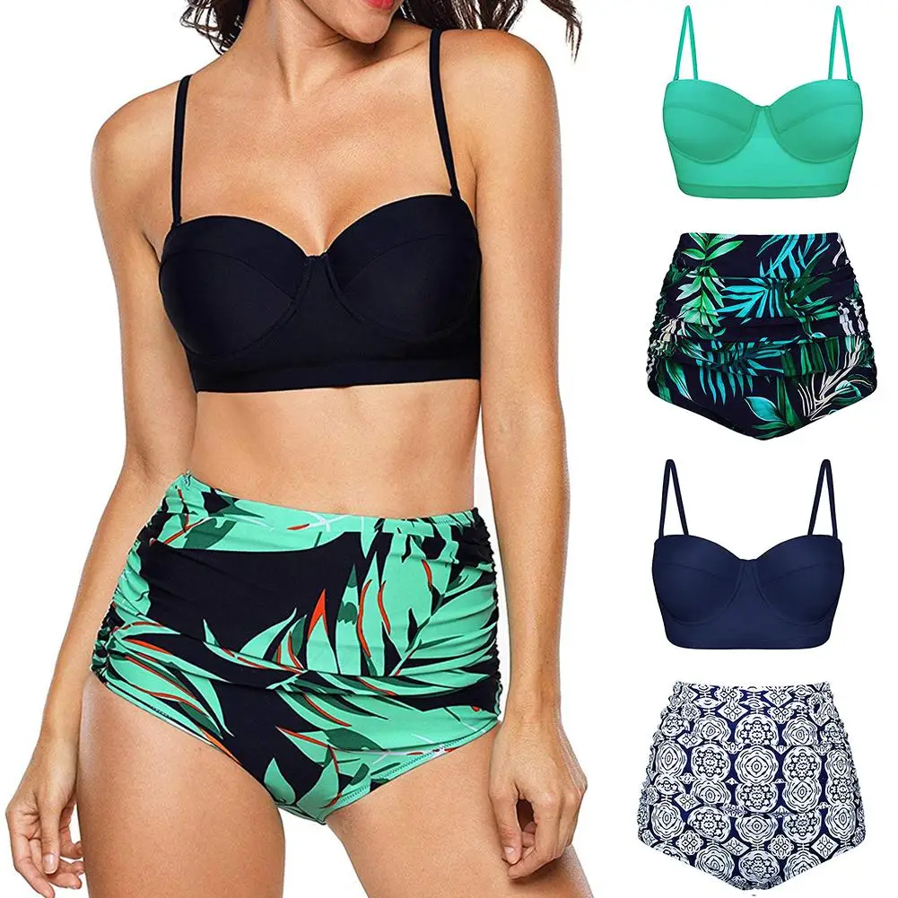 Особенности: листья/цветок/геометрический принт, два предмета, высокая талия, рюши, пуш-ап