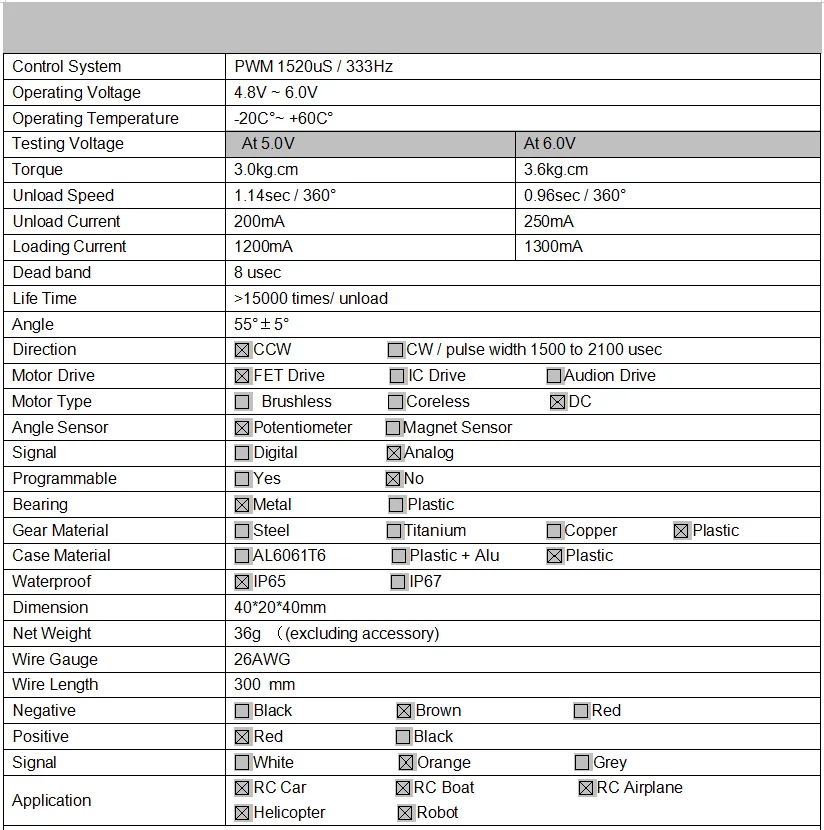 Крутящий момент, крутящий момент: 3,6 кг-см (49,99 унций) @ 6,0 V