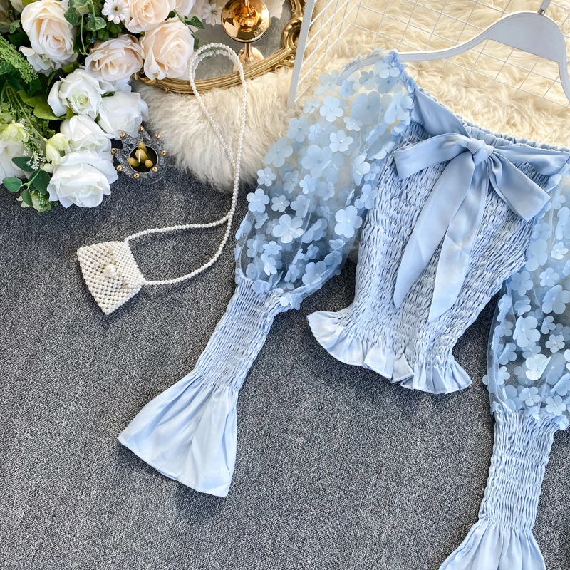 Кружевная блуза с пышными длинными рукавами, с открытыми плечами, Женская винтажная сексуальная женская одежда, бохо сетка, с вырезом лодочкой, повседневные Элегантные укороченные топы