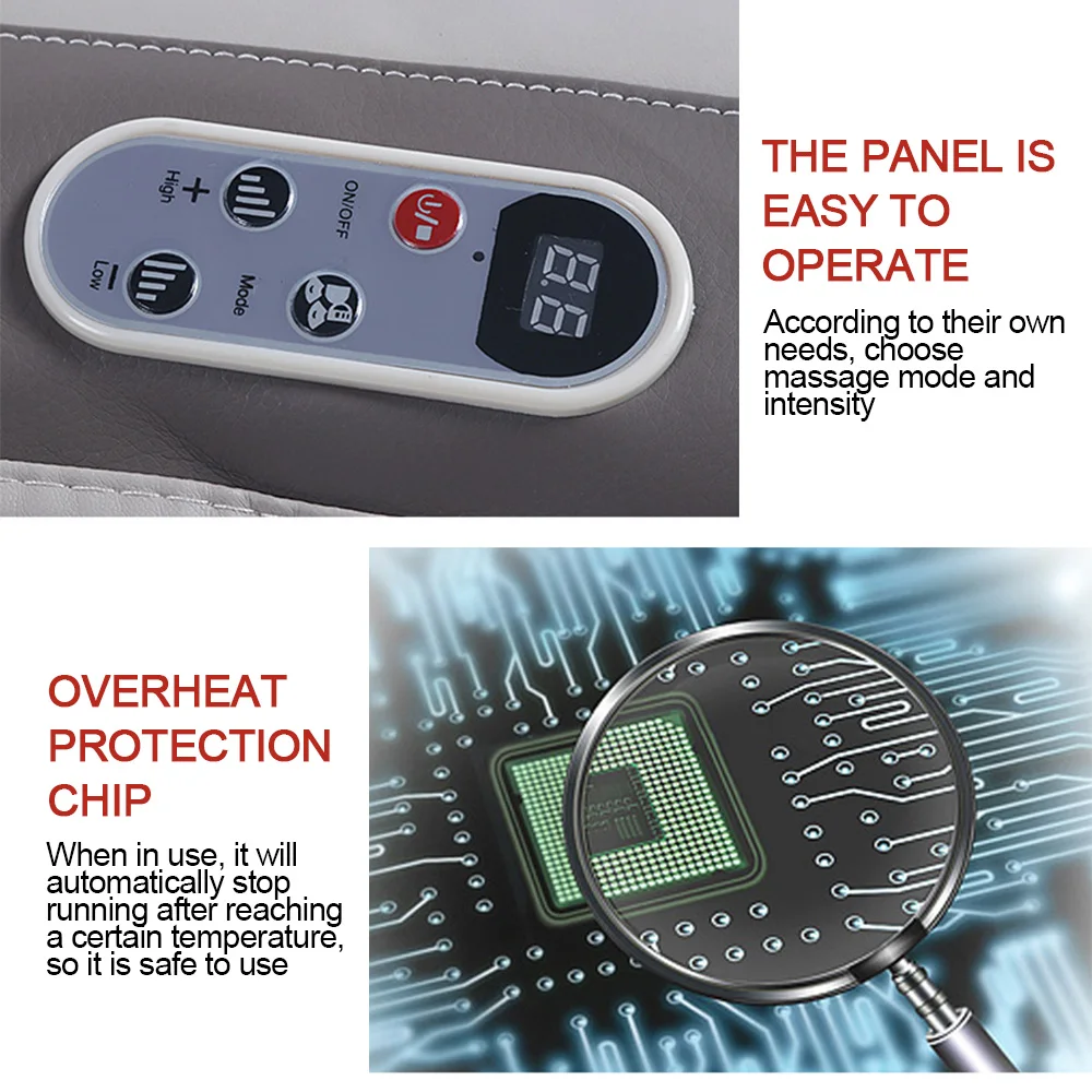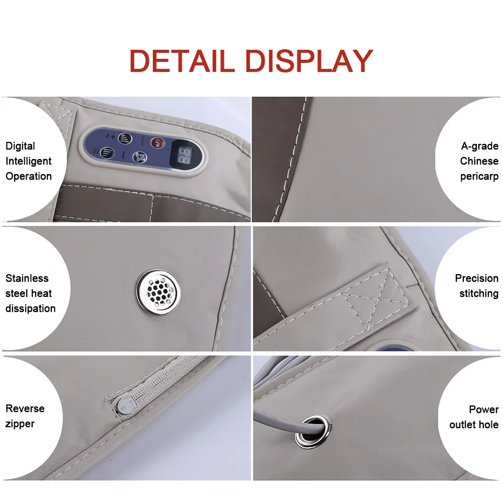 Особенности: 1. Инфракрасный нагревательный массаж, при разминании производят эффект горячего сжатия 2. Высококачественный материал из искусственной кожи, мягкий на ощупь 3. Комплексное устройство тепловой защиты, эффективно защищает безопасность человека и срок службы продукта. Когда внутренний двигатель перегревается или кварцевый волоконно-Инфракрасный механизм защиты от перегрева загорится, отрежьте ток, чтобы хост приостановился. После того, как температура снизится до безопасной критической точки, автоматически начинает работать снова. 4. Выбранный высококачественный двухслойный износостойкий сетевой дизайн, качество более надежное