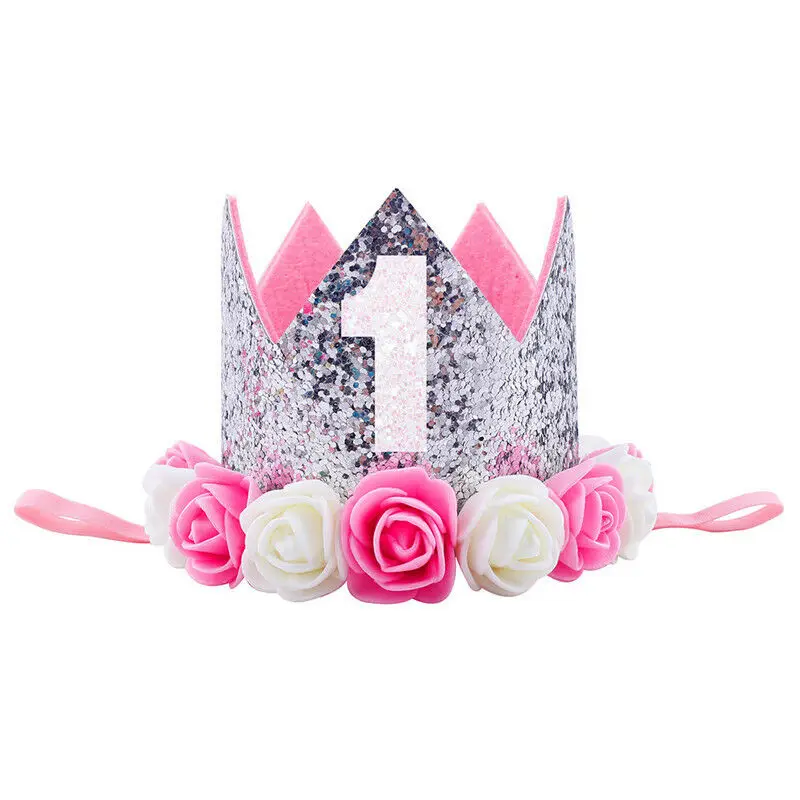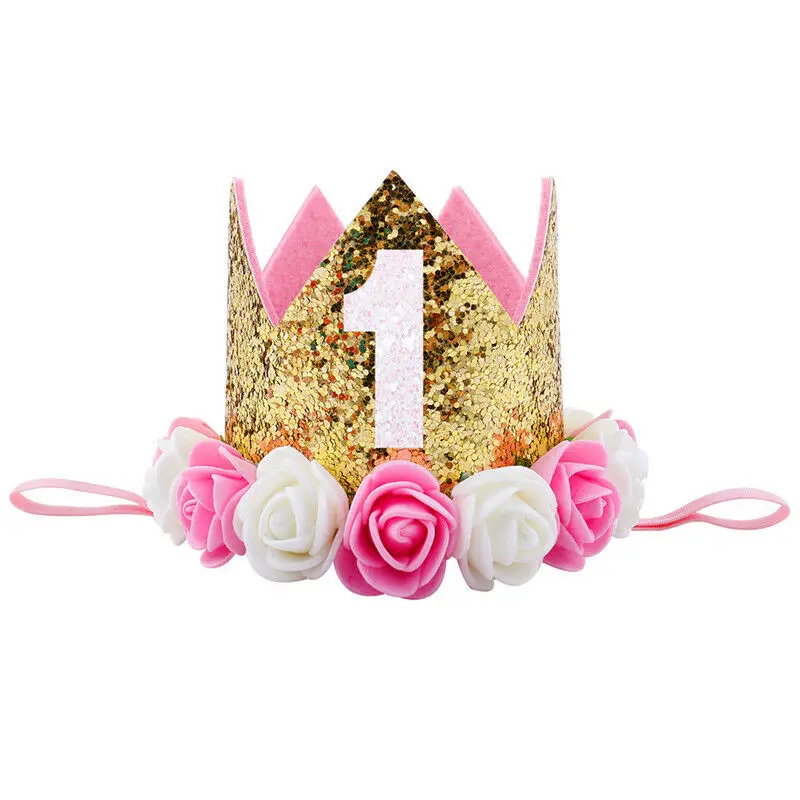 Kids Baby 1st Birthday Hat Glitter Crown Flower Head Hair Band Party Headwear
