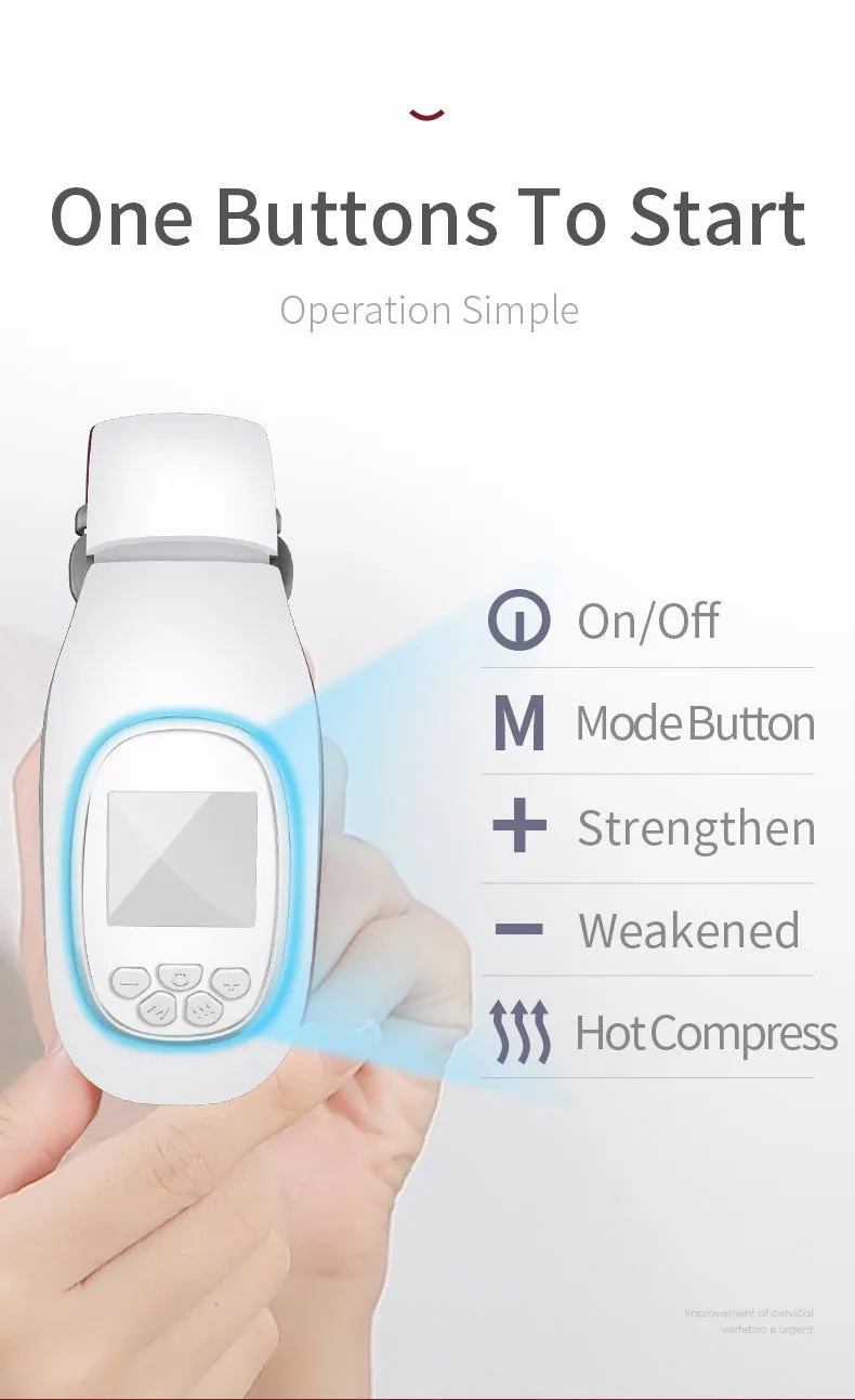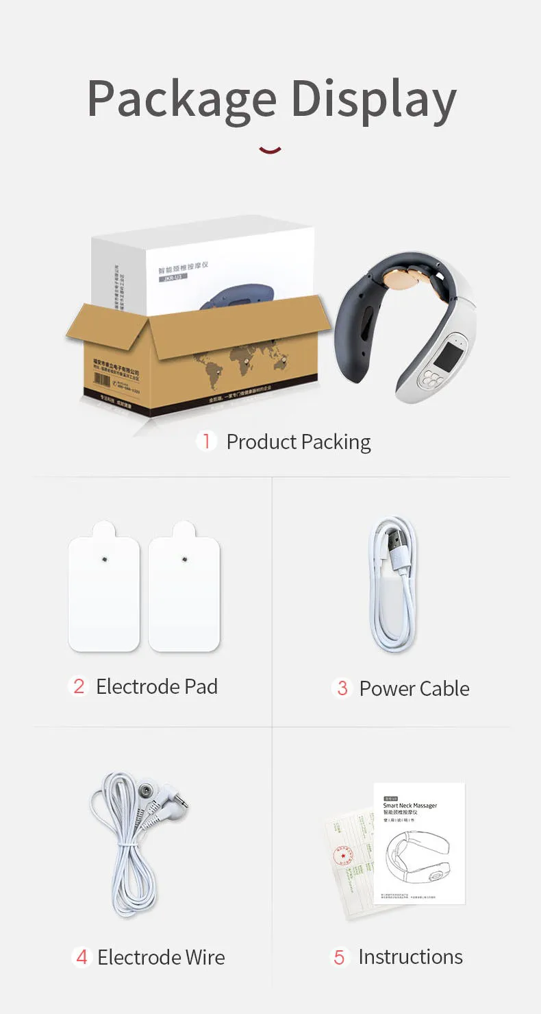 1. Технология Tens pulse 2. U-образный дизайн 3, три массажных головки 4, Интеллектуальный горячий компресс 5, 15 передач для управления 6, USB chargeing 7, легко носить с собой 8, 15 минут настройки 9, пульсовый массаж