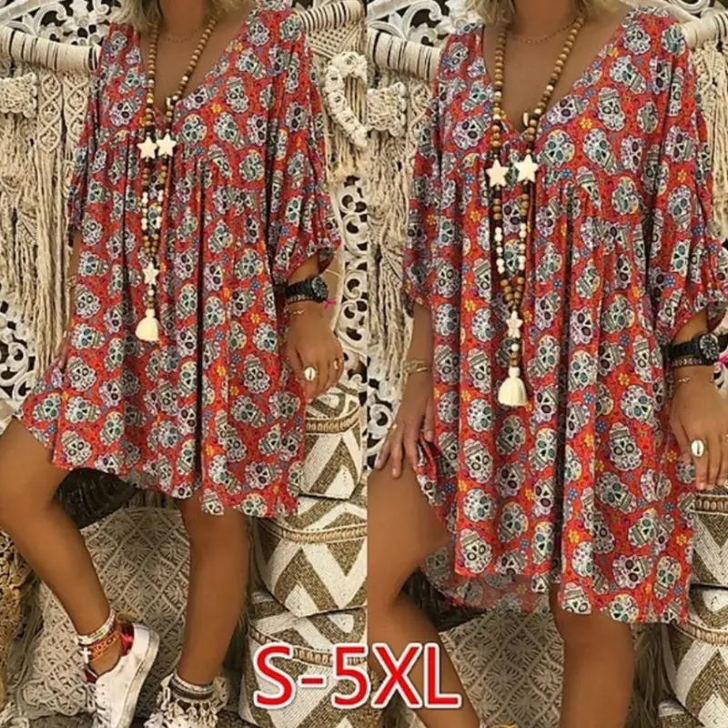 Женское платье с v-образным вырезом и рукавами 3/4, свободное платье-футболка с цветочным принтом, повседневные расклешенные вечерние платья-туники на Хэллоуин, S-5XL