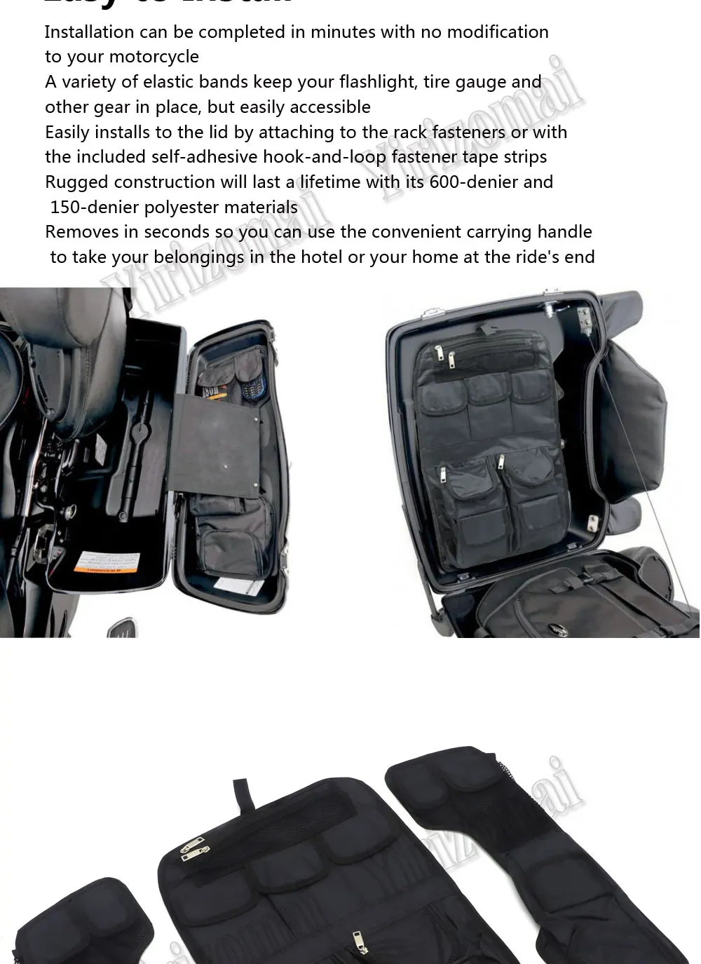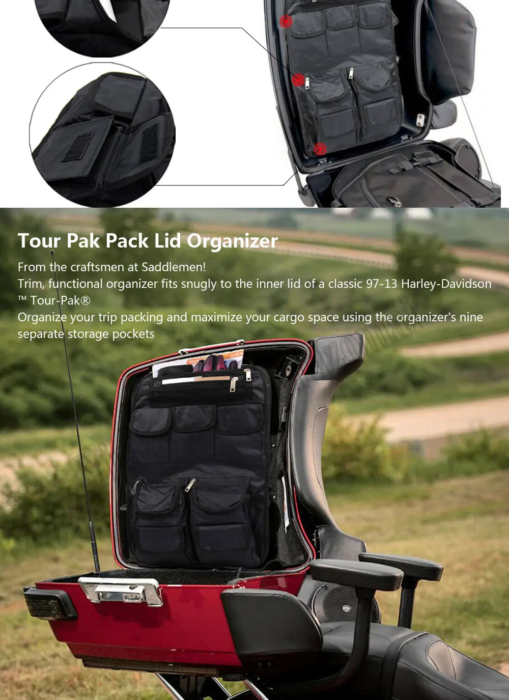 От мастеров в седле! Отделка, функциональный Организатор плотно прилегает к внутренней крышке классического 97-13 Harley-Davidson™Тур-Пак® Организуйте свою походную упаковку и Увеличьте свое грузовое пространство с помощью девяти отдельных карманов для хранения органайзера Установка может быть завершена в течение нескольких минут без модификации вашего мотоцикла Различные эластичные ленты поддерживают ваш фонарик, датчик шин и другое снаряжение, но легко доступны Легко устанавливается на крышку, прикрепляясь к крепежу для стойки или с помощью самоклеющейся клейкие полоски Прочная конструкция продержится всю жизнь благодаря 600-денье и 150-денье полиэфирных материалов Удаляет за считанные секунды, так что вы можете использовать удобную ручку для переноски, чтобы взять ваши вещи в отеле или вашем доме в конце езды Подходит: модели Harley-Davidson Touring FLHT/FLHR/FLHX/FLTR (w/OEM Tour Pak), 1993-2013 Простота установки, инструкции по установке не включены.