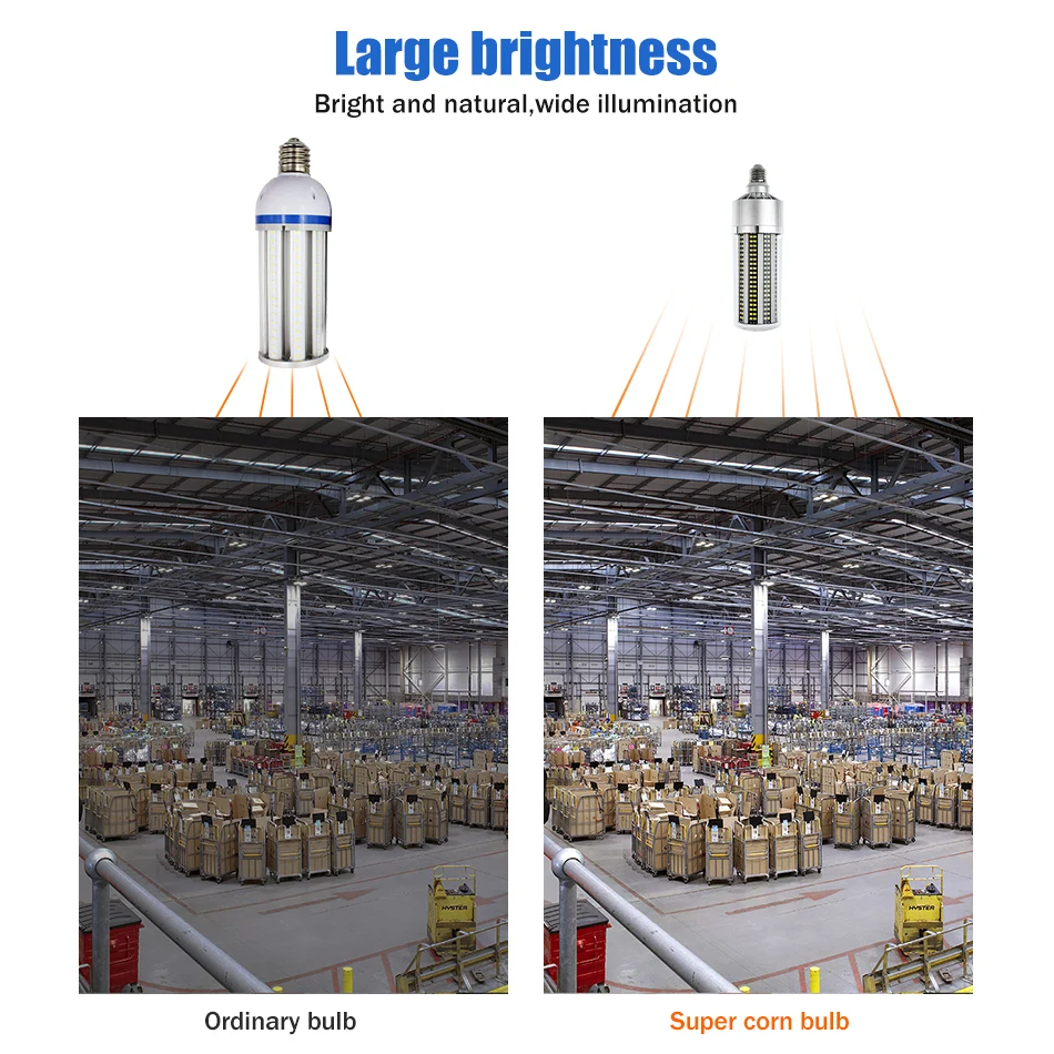Feature: * Smart IC: Import smart IC, flexible response, strong ability to protect the circuit. * Ball Cooling Fan: Ultra Mute, No Vibration. Quick heat dissipation. Advanced cooling system, more stable and safer. * 100% No Visible Flicker. * 100% Real Wattage and Lumen. * No UV or IR light radiation. * Seismic, impact resistance, non-thermal radiation, safe and stable, reliable. * Premium Aluminum alloy heat dissipated, high-temperature resistant and corrosion resistant. Very low heat generating. * Suitable for Garage, Warehouse, Basement, Supermarket, Workshop, Garden, Football Field, Street Lamp etc. Parameter: * Base Type SMD5730 LED Fan Corn Lamp E27/E26:25W / 35W / 50W/54W * Voltage: 85-265V (For Industrial Voltage & Household Voltage) * LED Quantity: 25W -105pcs, 35W-129pcs, 50W-153pcs, 54W-177pcs * Lumen: 25W -2881LM , 35W-2912 LM, 50W-5435 LM, 54W-6080 LM * Light Color: Warm White(2800-3200K) / Cold White(6000-6500K) * Beam Angle: 360 ° * CRI: >80+ * Material: Aluminium PCB / Frame * Cooling Method: Cooling Fan (Ultra Mute, No Vibration, Quick heat dissipation) * Lifespan: > 50000hours