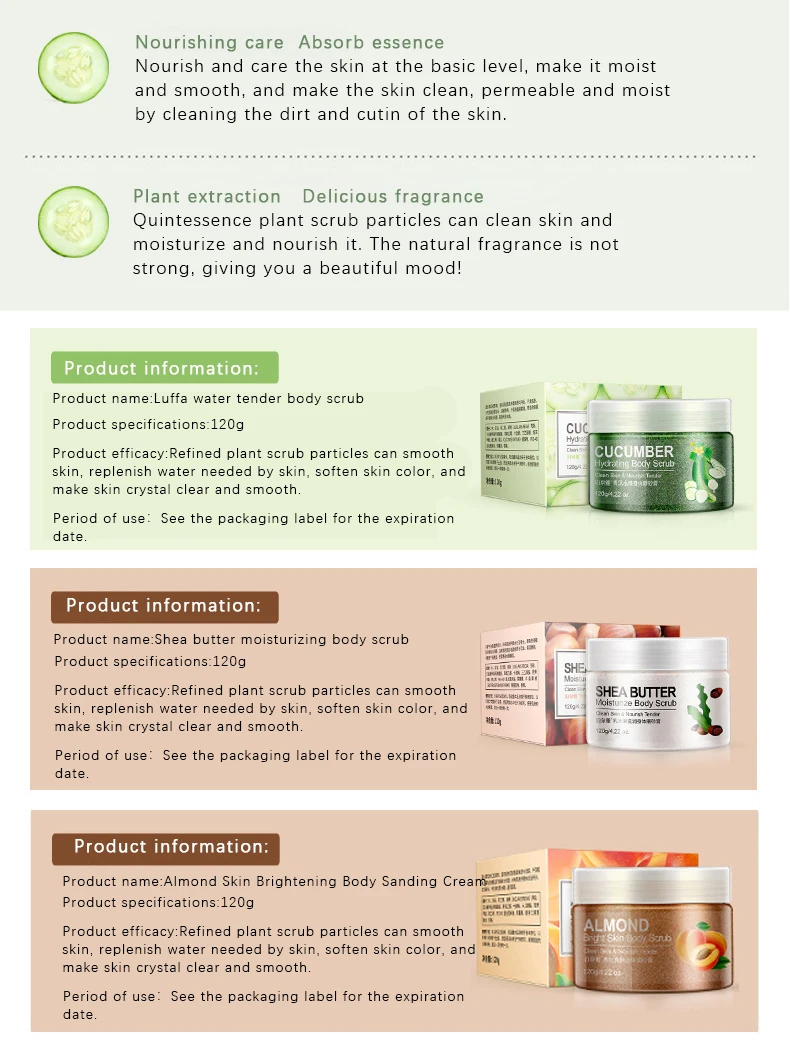 Питательный Уход поглощения сути Питает и ухаживает за кожей на базовом уровне, делает ее влажной и гладкой, а также делает кожу чистой, проницаемой и влажной, очищая грязь и кутин кожи. Завод добычи вкусный аромат Частицы растительного скраба queintessence очищают кожу, увлажняют и питают ее. Натуральный аромат не сильный, дарит вам прекрасное настроение! Информация о продукте: Название продукта: Luffa водный скраб для тела Название продукта: масло Ши Увлажняющий скраб для тела Название продукта: миндальная кожа Осветляющий крем для тела Характеристики продукта: 120 г Эффективность продукта: очищенные частицы растительного скраба могут разгладить кожу, пополнять воду, необходимую коже, смягчить цвет кожи и сделать кожу кристально чистой и гладкой. Срок использования: см. Этикетку на упаковке для даты истечения срока годности.