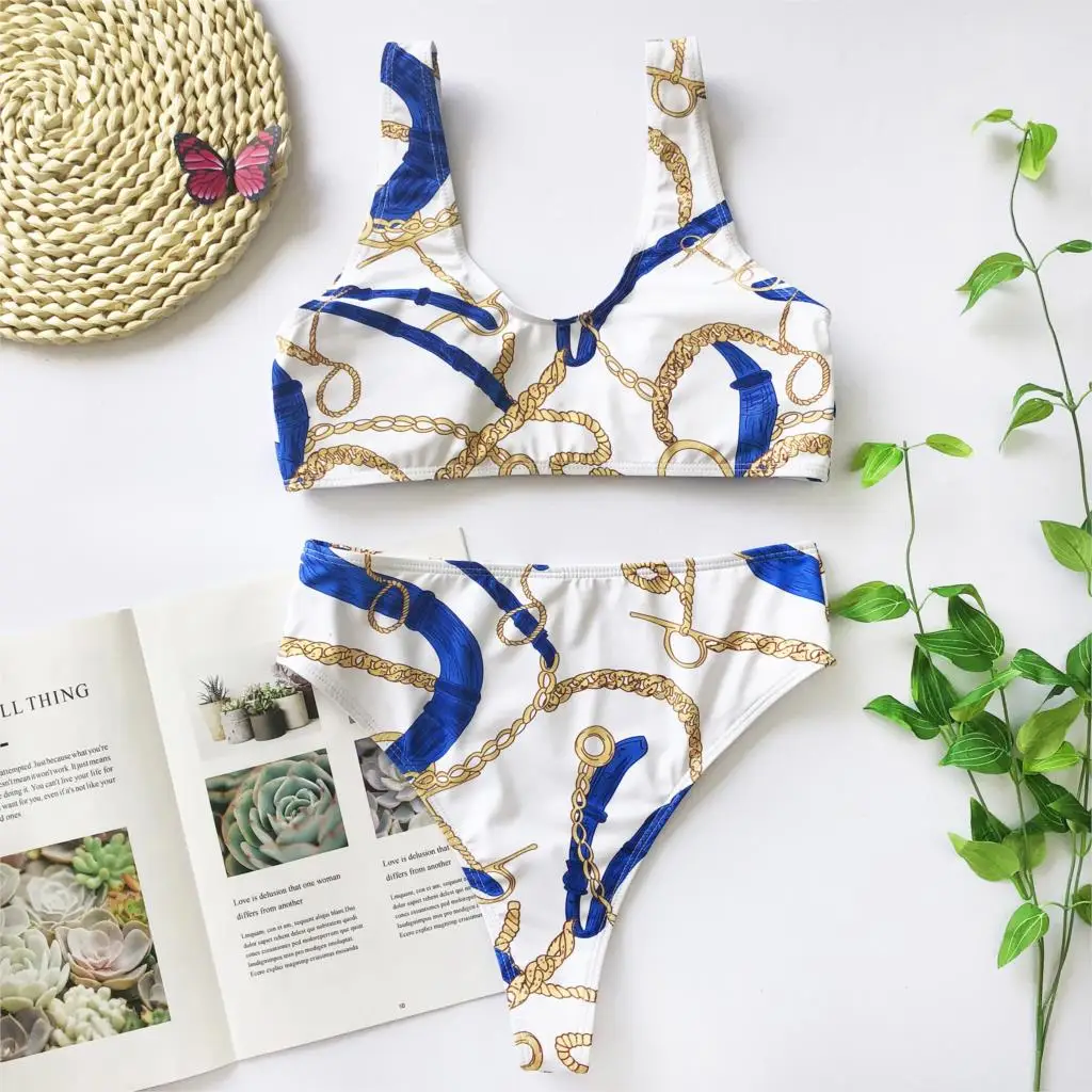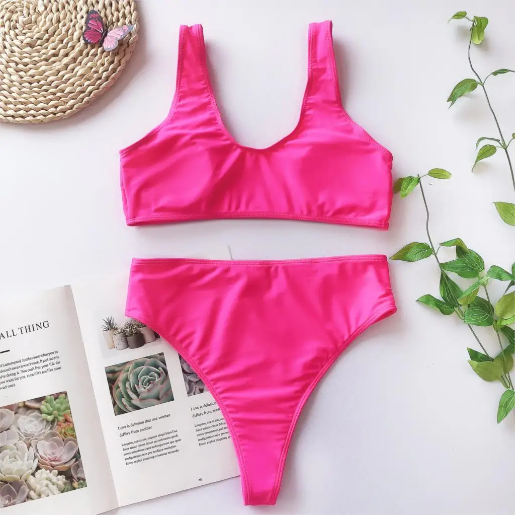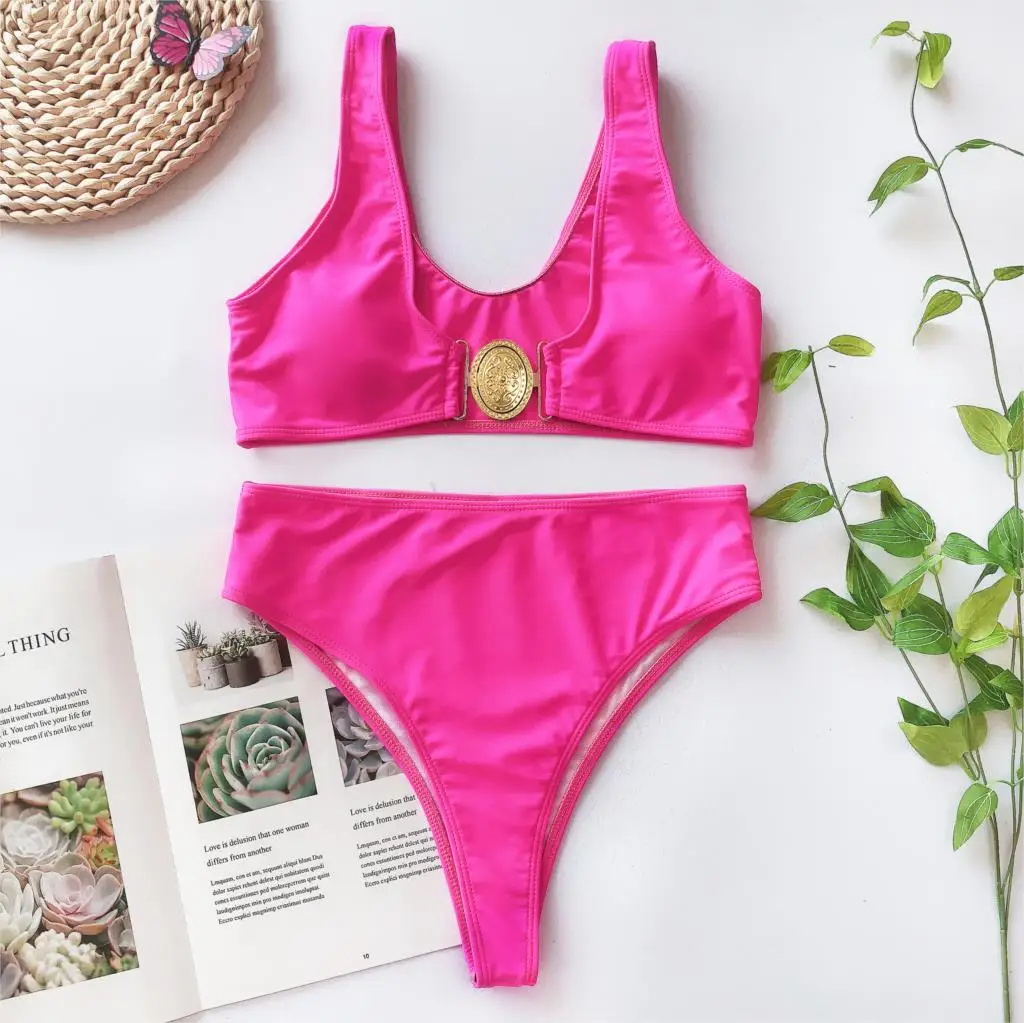 Розовый комплект бикини из 2 предметов, укороченный топ с пряжкой на груди, бюстгальтеры с высокой талией, Купальники пуш-ап, Mujer Biquinis, женские купальники, купальные костюмы