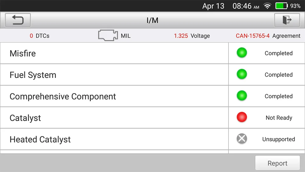 Быстрый доступ к функции I/M готовности диагностики OBD II. I/M относится к инспекциям и обслуживанию, которые были приняты правительством для соответствия европейским стандартам очистки воздуха. Готовность I/M указывает, работают ли различные системы, связанные с выбросами, на транспортном средстве должным образом и готовы к проверке и испытанию на техническое обслуживание.