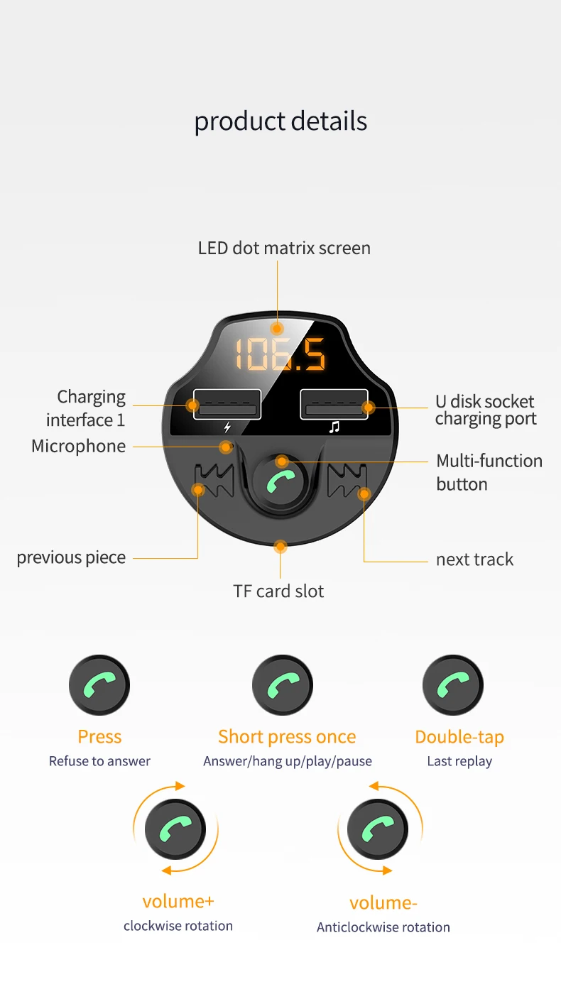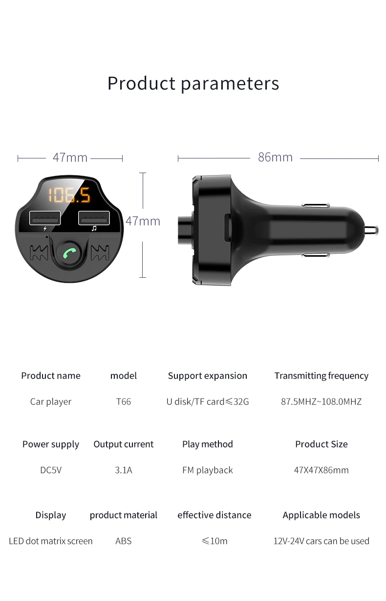 Автомобильный MP3-плеер с компактным размером и усиленной нескользящей шрапнель с обеих сторон подходит для автомобилей 12-24 В, внедорожников, фургонов, больших грузовиков, внедорожников и автобусов.