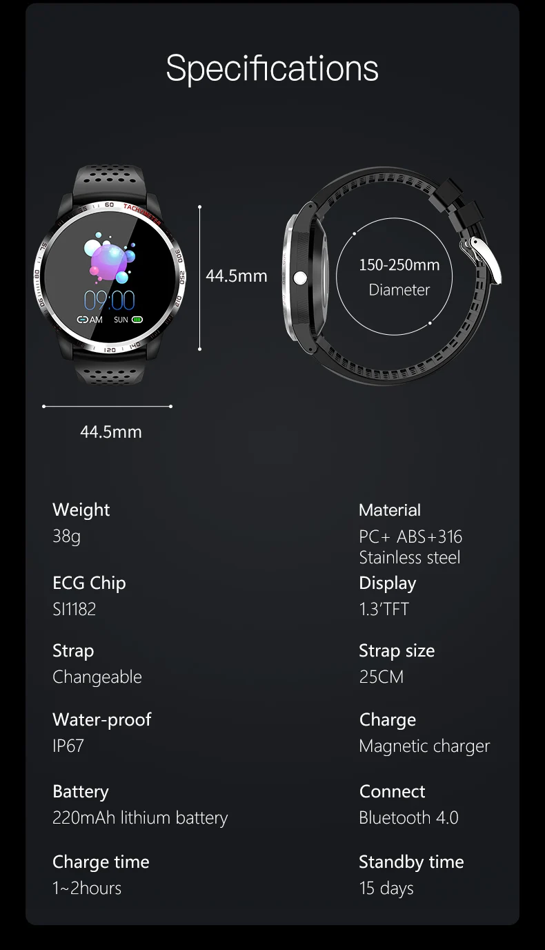 * 1,3 дюймов TFT 240x240 разрешение цветной экран, 32 м + 32 м * IP67 водонепроницаемый (можно носить под дождем, мыть руки, но не помещать в горячую воду) * Встроенный 220 мАч батарея, время работы около 5-7days, время работы в режиме ожидания: около 15 дней (определенное время использования связана с ваша частота использования. Часы могут регулировать яркость экрана и время экрана.) * Умные звонки и SMS напоминания и вечерние напоминания о сообщениях: звонки, Twitter, Facebook, Wechat и т. Д., все будут отправлены на запястье и с вибрационными оповещениями * Поддержка обнаружения сердечного ритма/измерение показателей ЭКГ/артериального давления * BLE 4,0, Поддержка Android 4,4 и iOS 8,0 версии или выше * Дополнительные функции: монитор сердечного ритма, выключения, с вибрационным напоминанием, будильник, функция напоминания о необходимости двигательной активности, Стандартный функции упражнений (шагомер, счетчик потребления калорий, измерение расстояния) Обнаружение сна (время сна, качество сна), красочные UI, мы поможем вам найти свой телефон, секундомер, лекарства напоминание, напоминание о питании