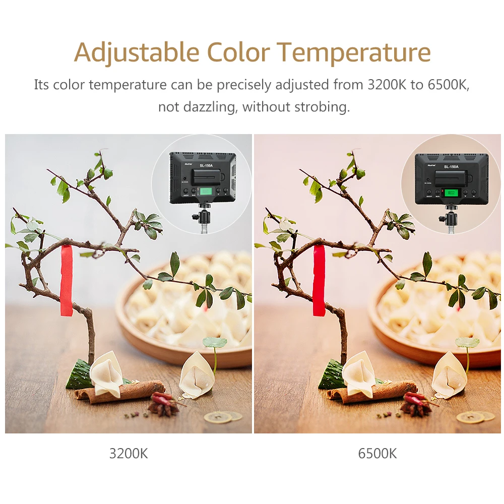 Регулируемая Цветовая температура и яркость:15 Вт Светодиодная панель для видеосъемки. Его яркость можно бесступенчато регулировать от 0% до 100%, умеренно, без вреда для глаз. Его цветовая температура может быть точно отрегулирована от 3200 K до 6500 K, не ослепительно, без стробинга.
