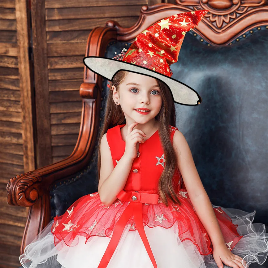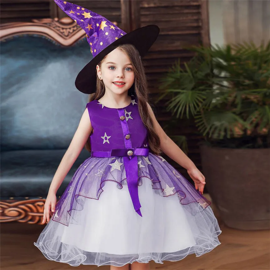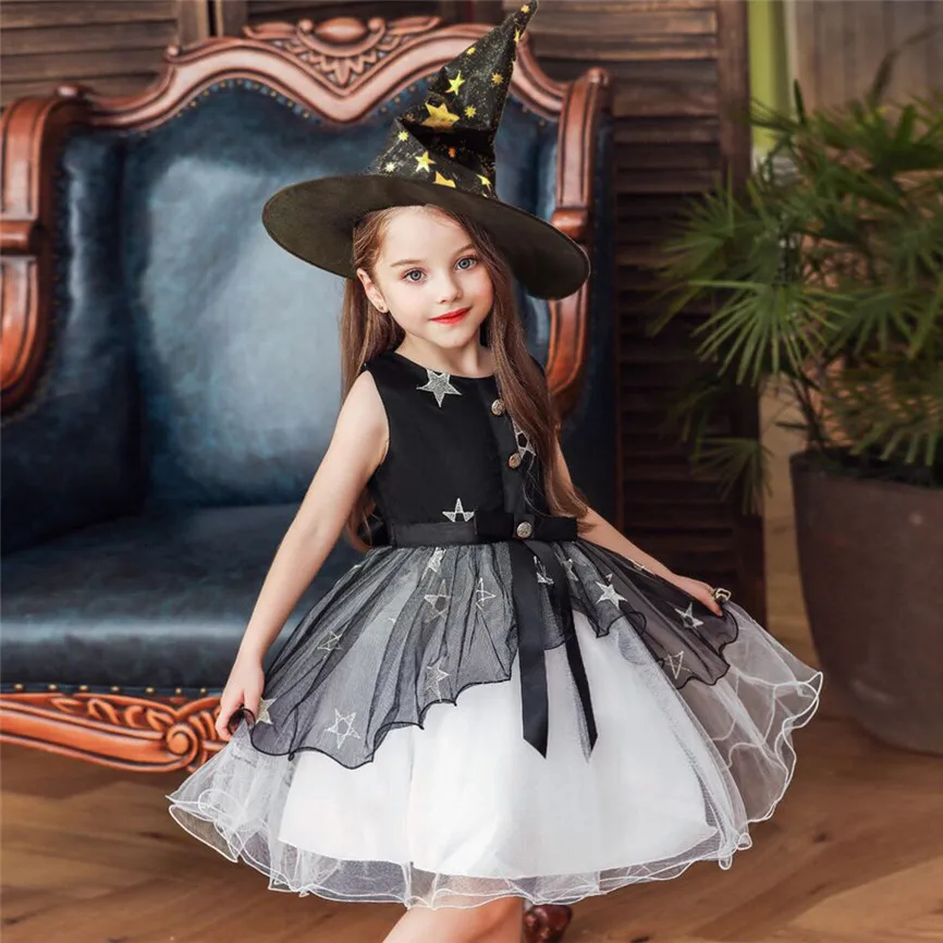 Платье принцессы с фатиновой юбкой на Хэллоуин с цветочным рисунком и звездами для маленьких девочек + шляпа