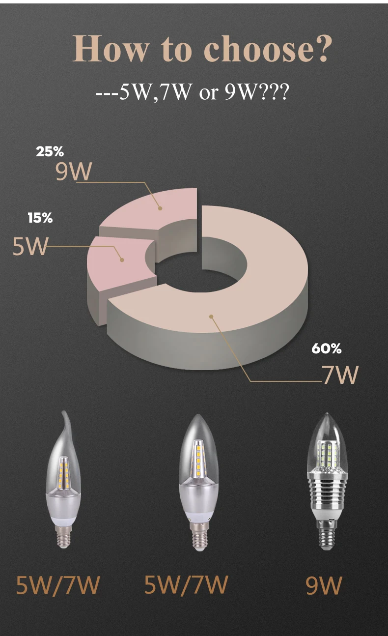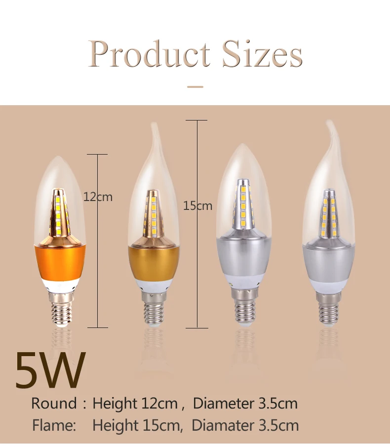 Product Name: LED Candle Bulb Power: 3W 5W Voltage: 220V Lamp Holder: E14 (Candelabra base) Color Temperature: Warm White 3500K Cold White 6500K CRI:>=80 Equivalent: 30 Watt Luminous Flux: 200 lm Dimmable: No Beam Angle: 360 Degree