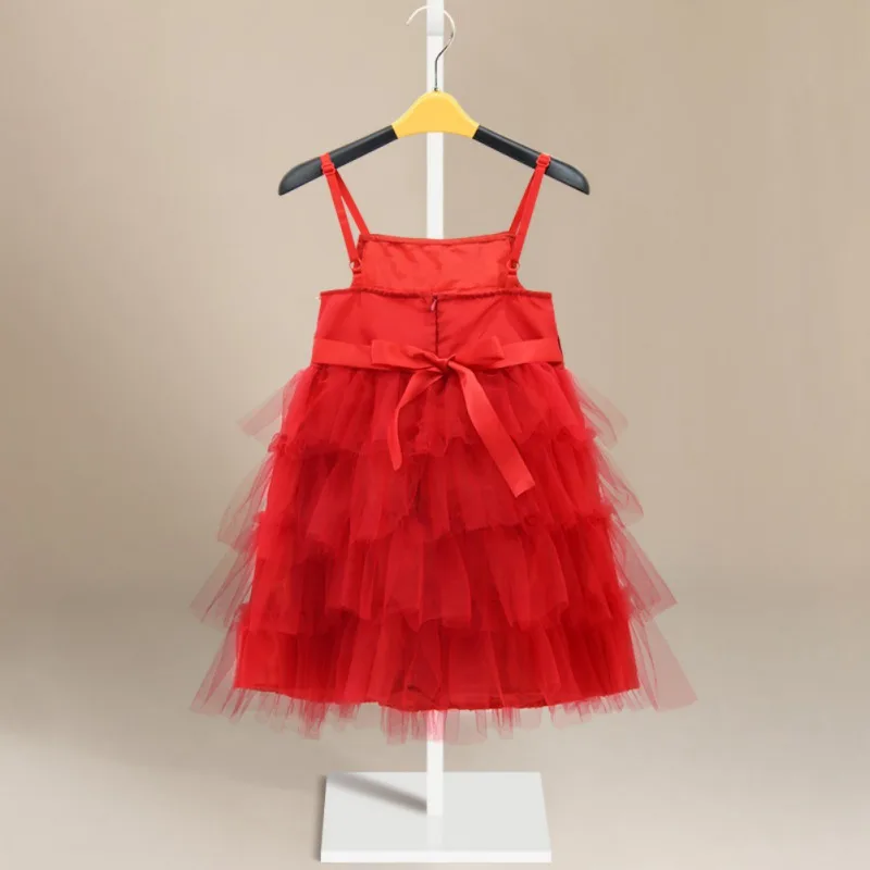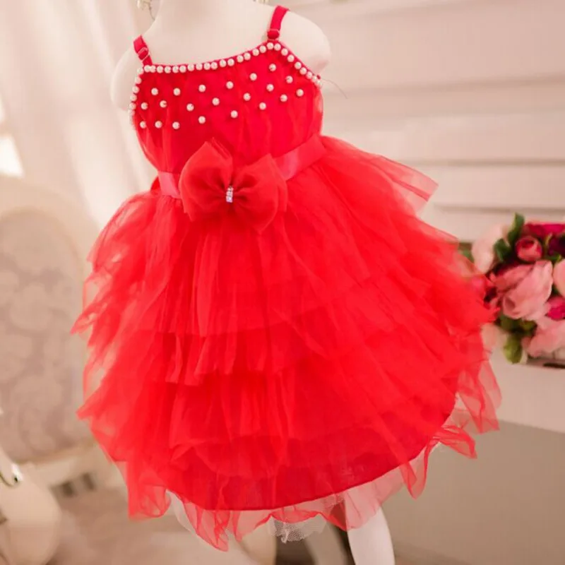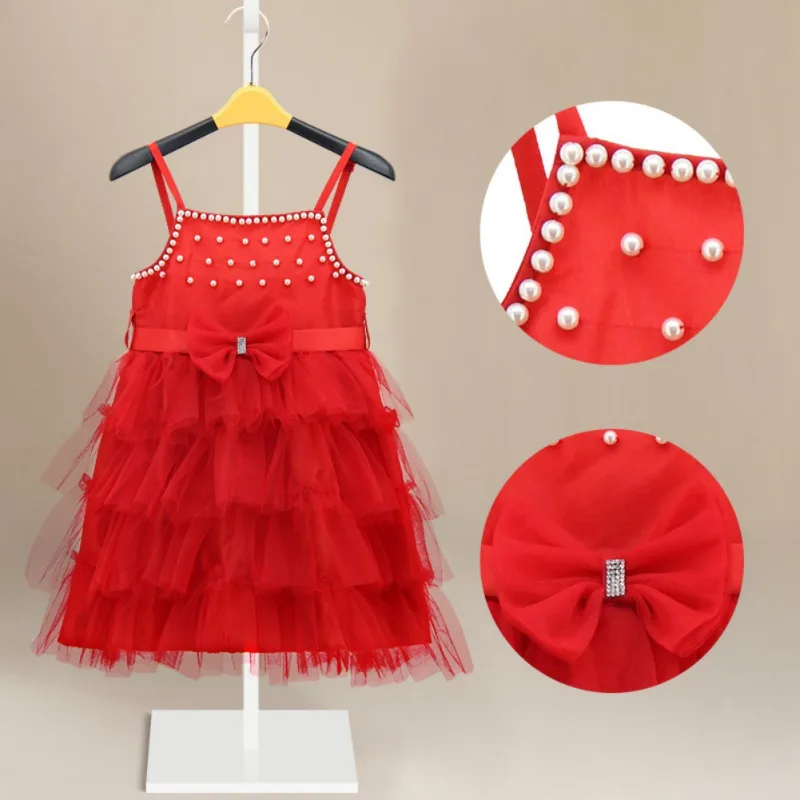Baby Girl Dress Red Strap Beaded Puff Gauze DressFashion Cotton Children Clothing