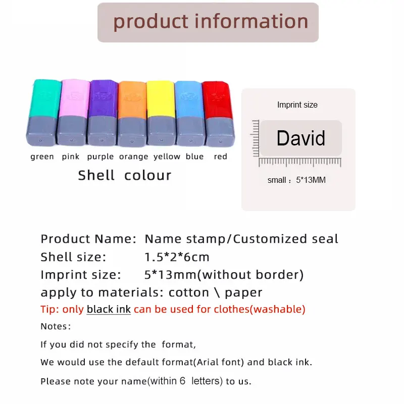 Название продукта: штамп с именем/по индивидуальному заказу. Фирменный штамп/самоклеящаяся печать. Размер корпуса: 1,5*6*2 см. Размер отпечатка: 5*13 мм. Цвет чернил: черный, красный. Применяются к материалам: хлопок (только черные чернила) \ бумага (черные и красные чернила). Совет: только черные чернила используется для одежды (моющаяся). Цвет веревки поставляется случайным образом. Поддержка языка: английский. Примечание: только 6 букв. Оригинальные чернила могут использоваться более 200 раз. Их достаточно для случайного использования.