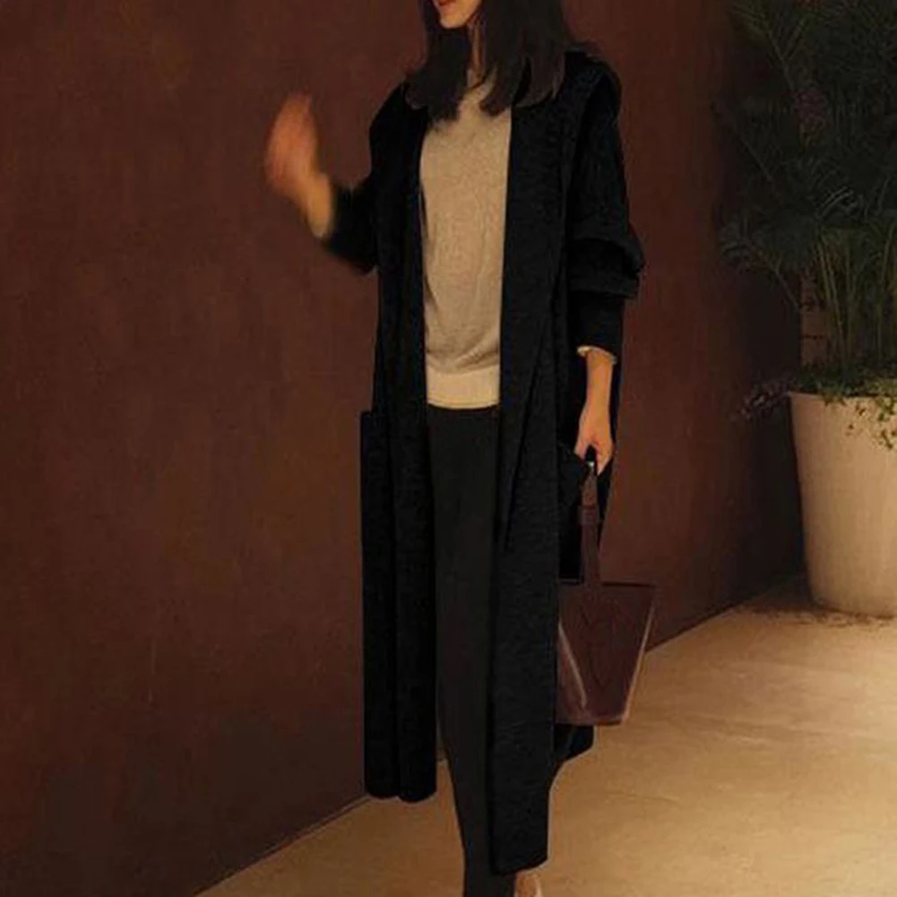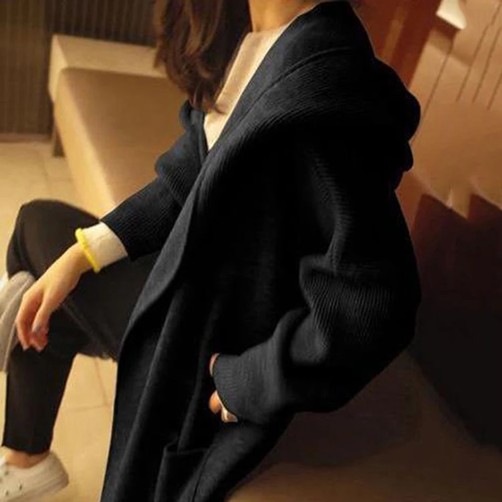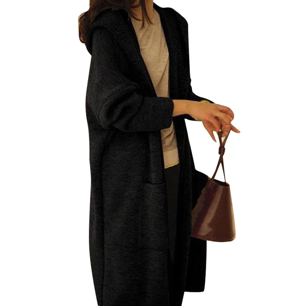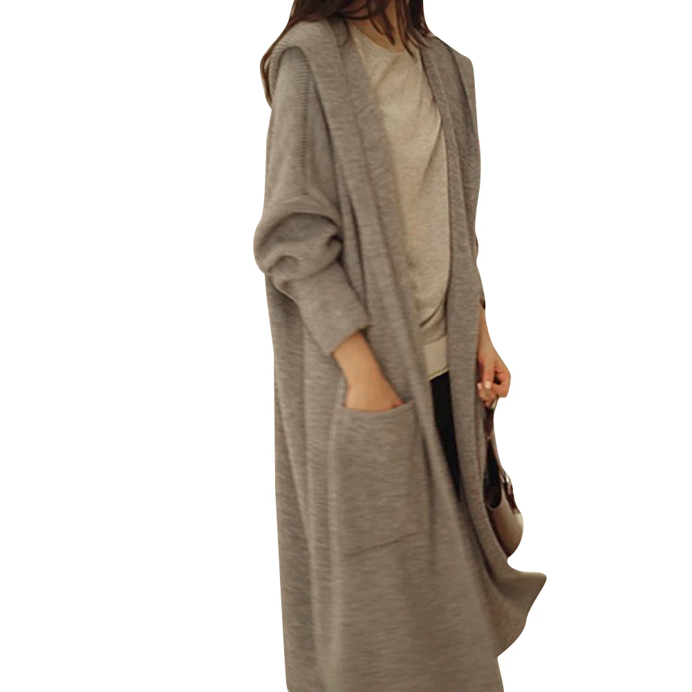 Женский однотонный осенний свитер выше колена с капюшоном, Свободный кардиган