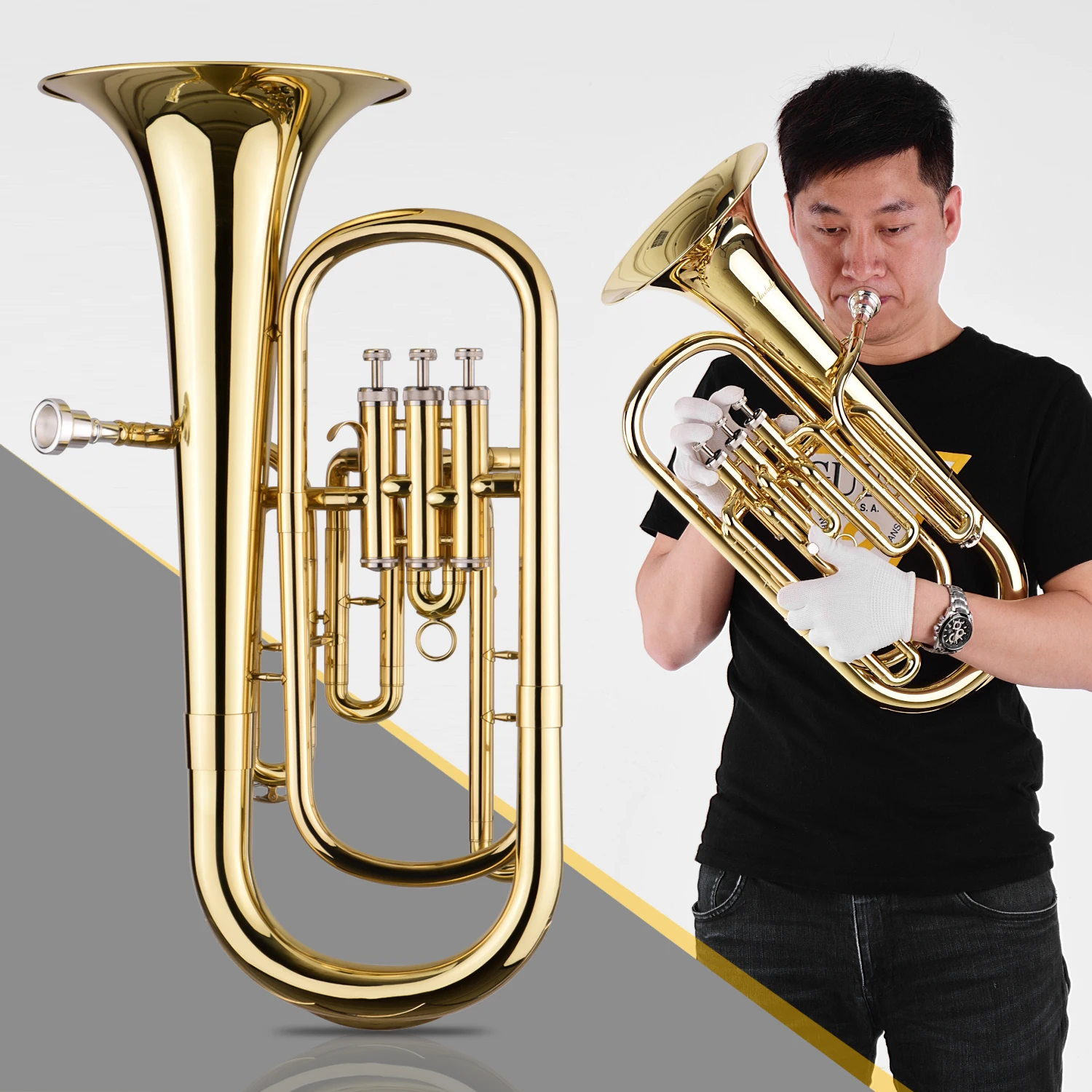 Высококачественный Bb baritone, популярный с латунными полосками, предлагает теплый, резонансный и четкий тон.
