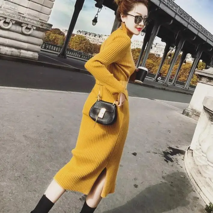 Женское трикотажное платье-свитер с длинным рукавом, облегающее платье в Корейском стиле на осень и зиму