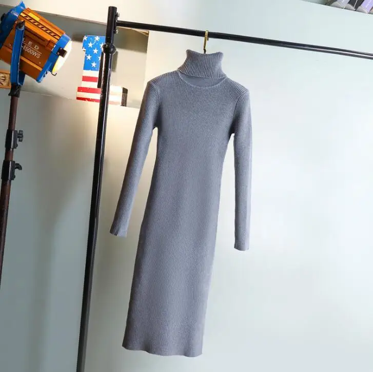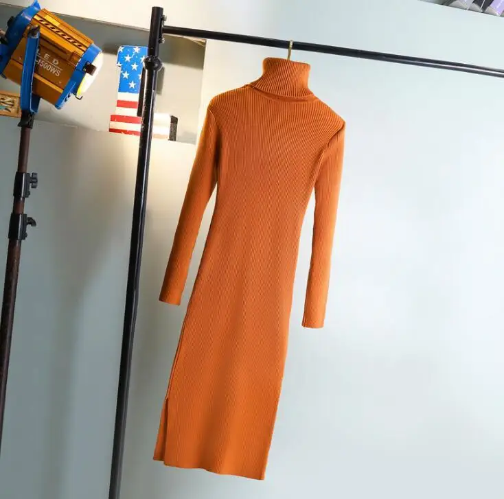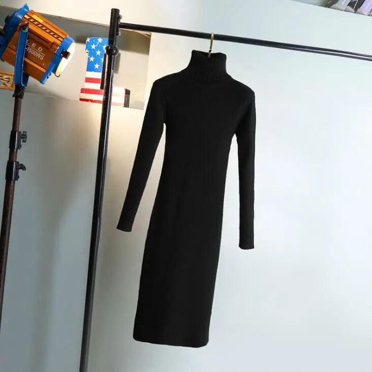 Женское трикотажное платье-свитер, осенне-зимнее теплое облегающее кашемировое платье-пуловер с длинным рукавом и высоким воротником, 2019