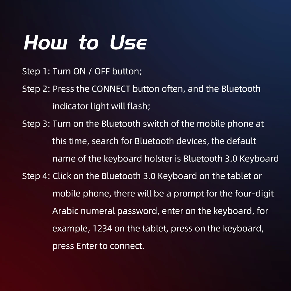 Параметры клавиатуры: 1. Соответствует стандарту Bluetooth 3,0 + HS; Включая BQB, FCC, CE, ROHS и другие соответствующие сертификаты; 2. Расстояние может достигать более 10 м. 3. Метод модуляции: 2,4 ГГц 4. Рабочее напряжение: 3,0-5V 5. Рабочий ток <4.0MA 6. Ток в режиме ожидания 20UA 7. Ток сна <2μA 8. Зарядный ток ≥ 100 мА. 9. Время работы в режиме ожидания составляет 100 дней 10. Прочность кнопки: 80 ± 10 г 11. Срок службы кнопки может достигать 5 миллионов раз. 12. Рабочая температура: -10 - + 55 °C 13. Влажность: 20%-50% 14. Подходит для IOS; ANDROID; Универсальная клавиатура WINDOWS. 15. Вышеуказанная bluetooth-клавиатура производится с помощью программы PCBA board Broadcom. Клиенты могут заказать язык каждой страны в соответствии с их потребностями: стандартный английский, американский английский, русский, немецкий, французский, корейский, японский, шведский, польский, скандинавский, бразильский, датский, испанский, португальский, арабский, казахский, иврит и тайваньский, И другие языки других стран. (Если вам нужно что-то другое, кроме английского, свяжитесь с нами, настраиваемый язык) Применимые модели: Увеличитель экрана мобильного телефона 4,5 дюйма-6,8 дюйма (или мобильного телефона шириной 6-9,5 см), подходят ко всем андроидам, или системы Apple с Bluetooth с поддержкой телефонов есть в наличии. Инструкции по уходу за изделием Шаг 1: Включите кнопку ВКЛ/ВЫКЛ Шаг 2: часто нажимайте кнопку подключения, и Индикатор логотипа Bluetooth будет мигать. Шаг 3: в это время Включите bluetooth-переключатель на мобильный телефон и выполните поиск устройства Bluetooth. Название кобуры клавиатуры по умолчанию-клавиатура Bluetooth 3,0. Шаг 4: нажмите на клавиатуру Bluetooth 3,0 на планшет или мобильный телефон. Будет пароль для четырех арабских цифр. Введите его на клавиатуре, например, Подсказка 1234 на планшете. Нажмите на клавиатуру и нажмите Enter для подключения.
