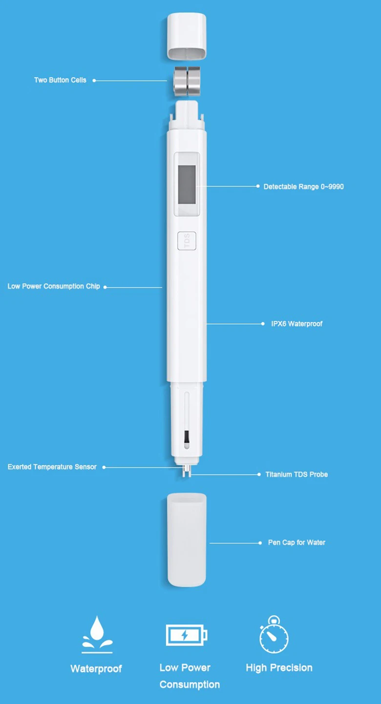 В комплект не входит аккумулятор, покупателю необходимо поместить 2 батарейки AG13 для его использования. Ручка, которая может проверить качество воды, также определяет, требуется ли очистка. Ручка Mi TDS реагирует на органические соединения и тяжелые металлы, такие как никель, chro mi um и т. д., и растворимое содержание соли. Ручка является водонепроницаемой IPX6, имеет автоматическую калибровку температуры и точность измерений.