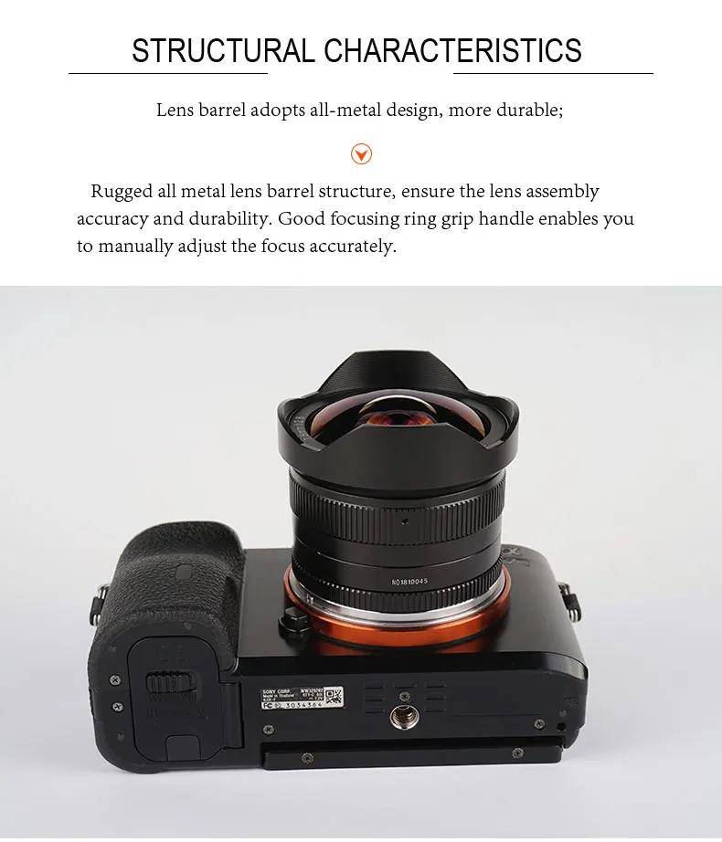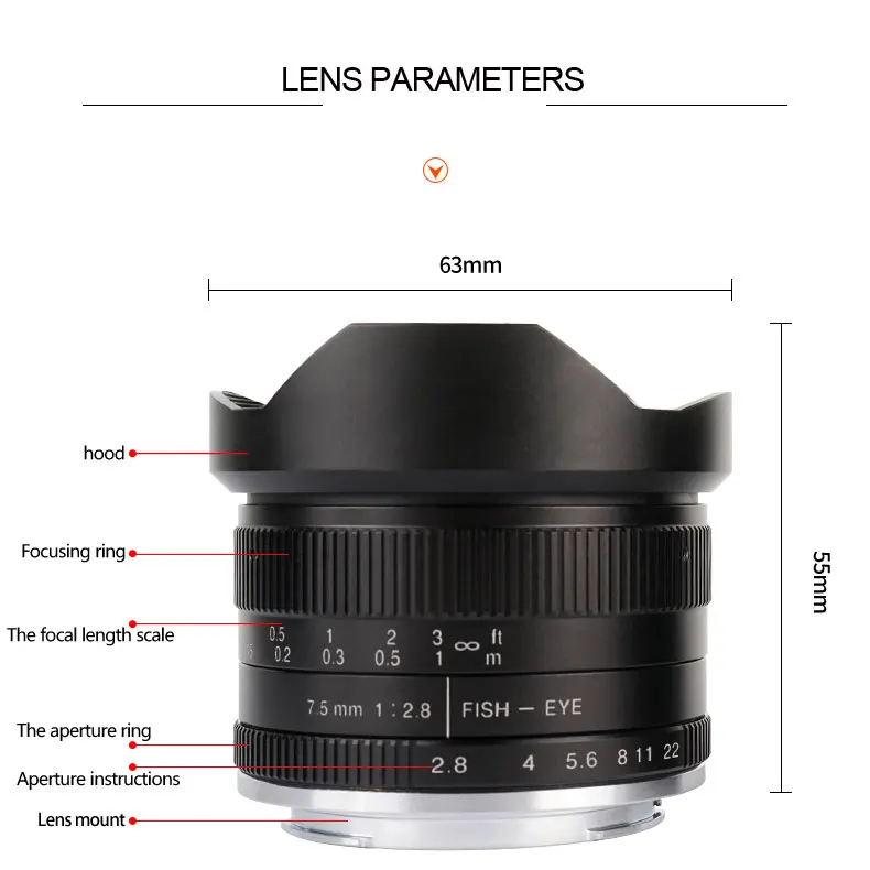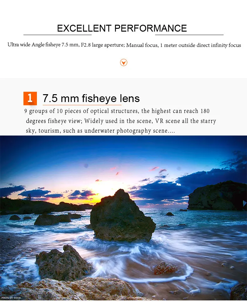 1. Компактный функциональный эпицентру событий объектив 7 ремесленников 7,5 мм/f2.8 объектив рыбий глаз с максимальной диафрагмой F/2,8. Ближайший к нему и расстояние фокусировки