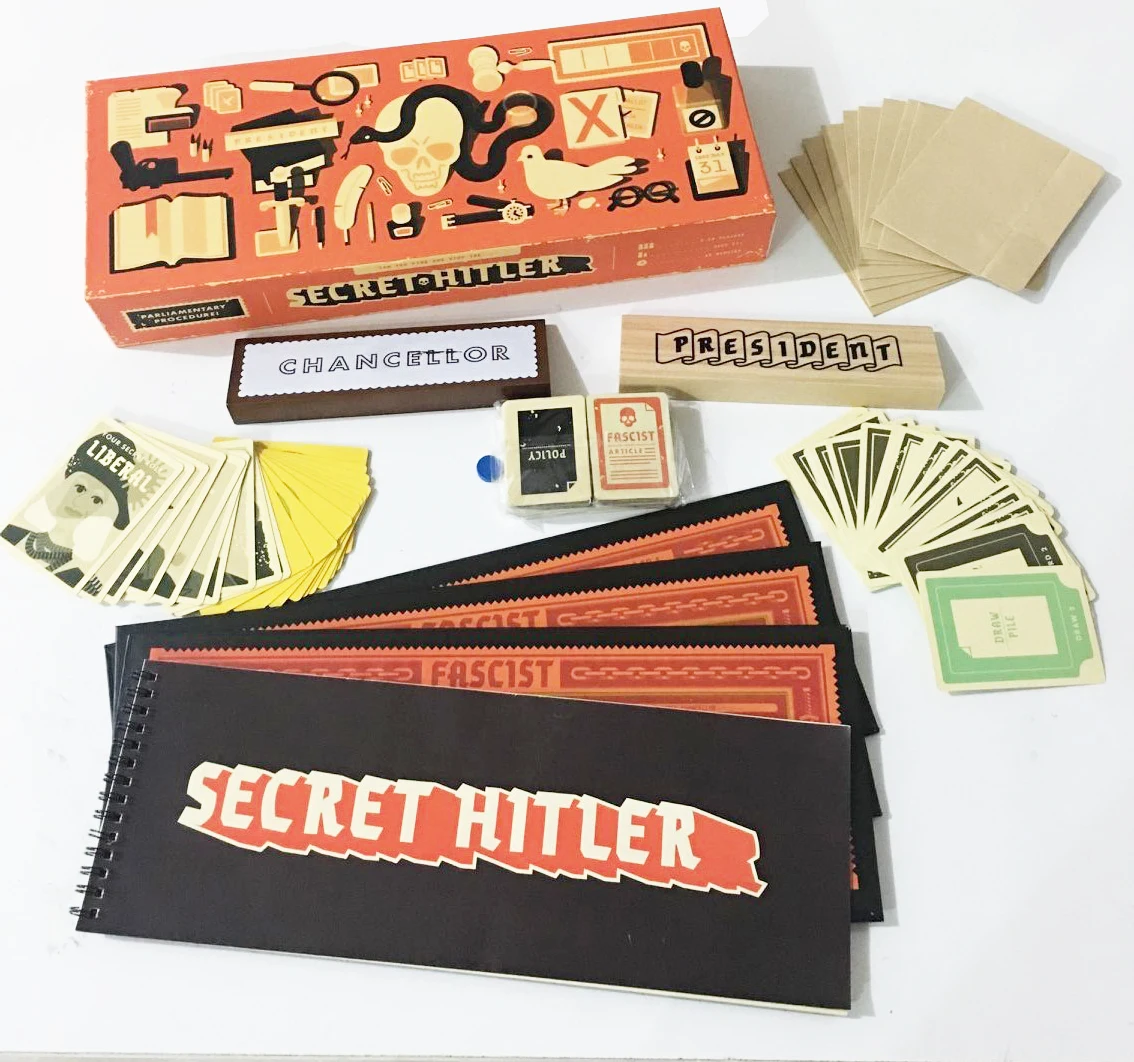 Секретный ГитлерПредставляет собой эффектный игра политических интриг и благосклонность в 1930s (Германия). Каждый игрок выбирается случайным образом и тайно, чтобы быть свободным или фашистским, и один игрок тайный Гитлер. Фашисты координируют свою работу, чтобы сеять недоверие и устанавливать своего хладнокровного лидера; Освободители должны найти и остановить тайного Гитлера, прежде чем будет слишком поздно. У либеральной команды всегда есть большинство.
