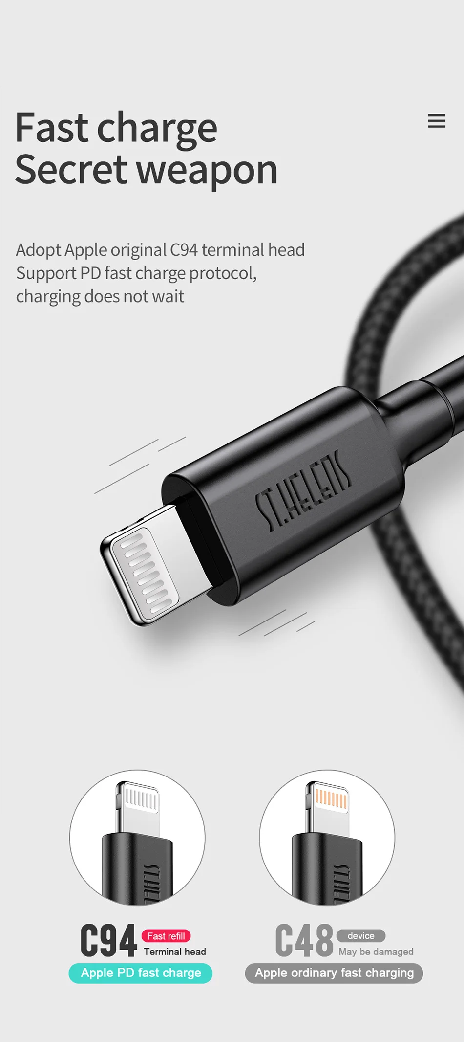 1. Выберите оригинальный терминал C94 apple, анти-окисление и отсутствие ржавчины, и поддержка PD Протокол быстрой зарядки, зарядка без ожидания 2. Обновление с IOS без изменения кабеля 3. На основе технической защиты MFI сертификации, зарядное напряжение является более стабильным 4. Нейлоновый плетеный корпус, прочный изгиб, прочный и грязеотталкивающий