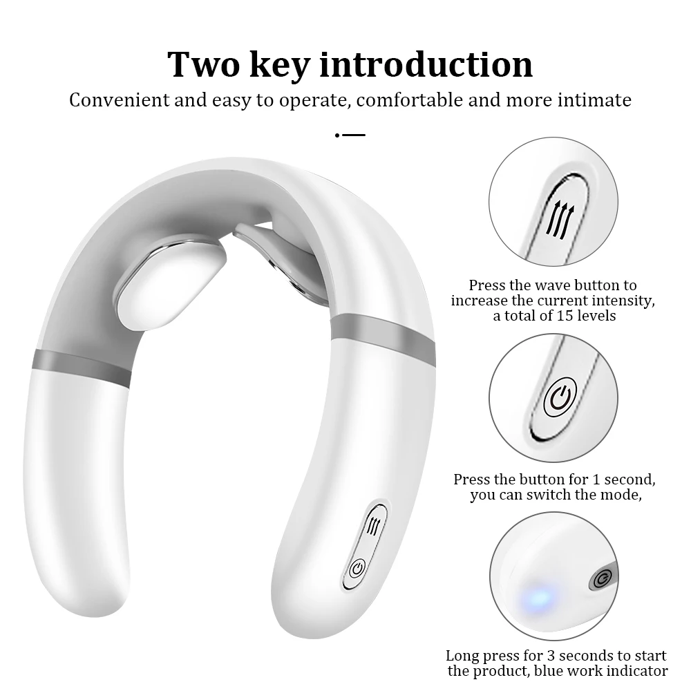 Материал: АБС-пластик, силикон Напряжение: DC5V Источник питания: USB Емкость аккумулятора: 650 мАч Время зарядки: 2-3 часа Время использования: 2 часа Особенности: массажный инструмент, профилактика спондилеза шейки матки, физиотерапия, многофункциональная Размер продукта: 17,5*13*13 см Примечание: Используйте влажное полотенце, чтобы намочить шею перед использованием, чтобы избежать ощущения пронзительной боли. Как использовать: 1) перед использованием, сначала Смочите кожу шейного отдела позвоночника влажным полотенцем, а затем поместите изделие вокруг шеи, сделайте электрод ближе к коже шейного отдела позвоночника, отрегулируйте положение продукта, включите хост и настройте соответствующую интенсивность и режим массажа. 2) Нажмите кнопку [ВКЛ/ВЫКЛ], чтобы войти в режим по умолчанию, положение передачи по умолчанию (0 передач). 3) Нажмите кнопку [M] для переключения режима, доступно 6 режимов. 4) Нажмите [+]/[-] кнопку для регулировки интенсивности 5) нажмите среднюю кнопку для нагрева.