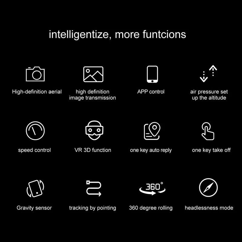 Функция: Видео/фотография/подъем и вниз/вперед и назад/поворот влево и вправо/полет влево и вправо/парение/вращение на 360 градусов/высота