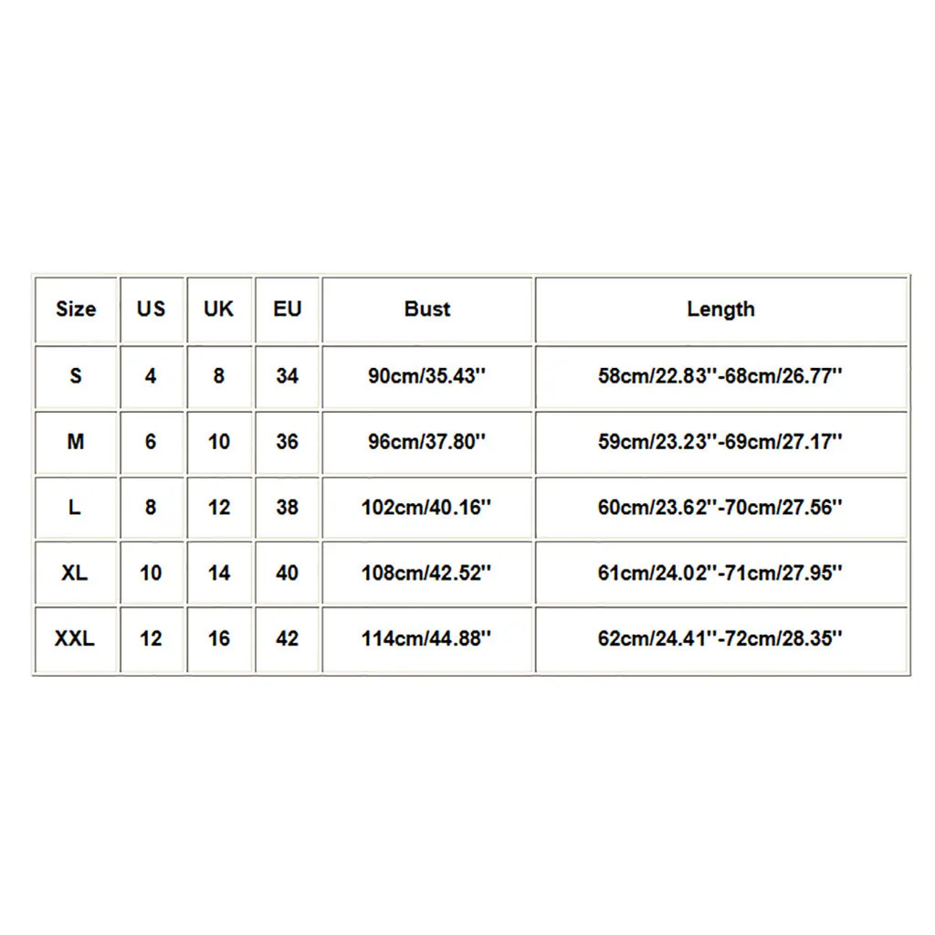 Размер США Великобритания ЕС Бюст Длина S 4 8 34 90 см/35,43'' 55 см/21,65'' М 6 10 36 96 см/37,80'' 56 см/22,05'' L 8 12 38 102 см/40,16'' 57 см/22,44'' XL 10 14 40 108 см/42,52'' 58 см/22,83'' XXL 12 16 42 114 см/44,88'' 59 см/23,23''