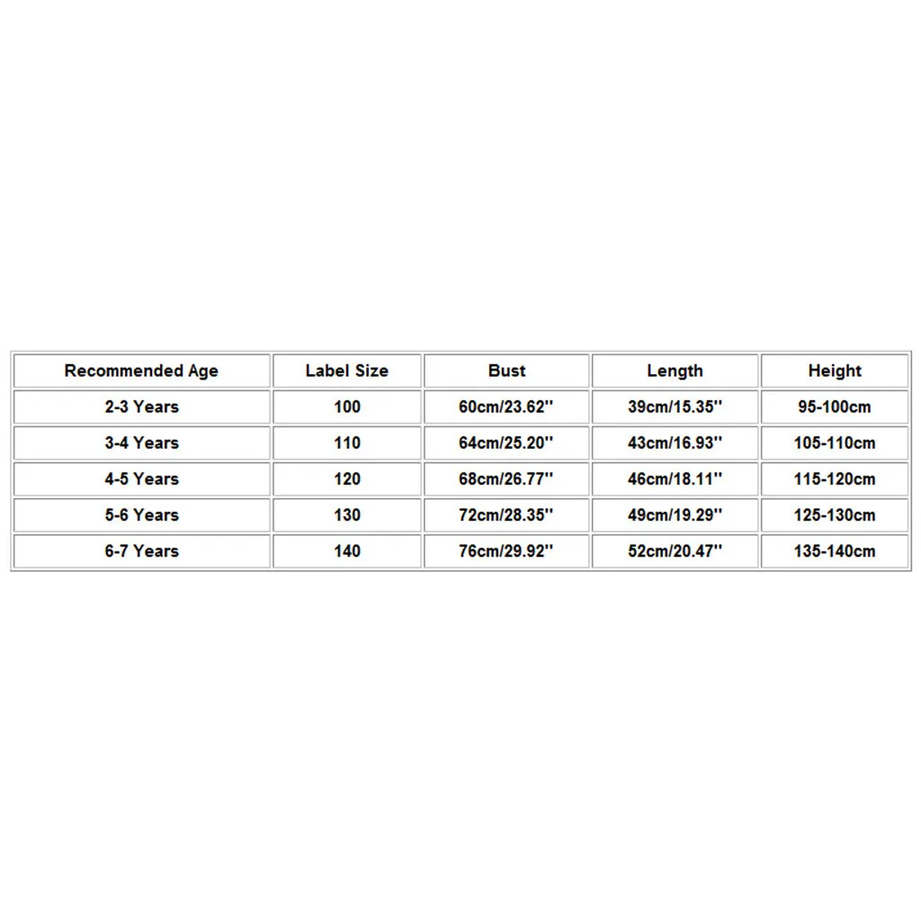 Рекомендуемый возраст Размер этикетки Бюст Длина Высота От 2 до 3 лет 100 60 см/23,62'' 39 см/15,35'' 95-100 см От 3 до 4 лет 110 64 см/25,20'' 43 см/16,93'' 105-110 см От 4 до 5 лет 120 68 см/26,77'' 46 см/18,11'' 115-120 см От 5 до 6 лет 130 72 см/28,35'' 49 см/19,29'' 125-130 см От 6 до 7 лет 140 76 см/29,92'' 52 см/20,47'' 135-140 см