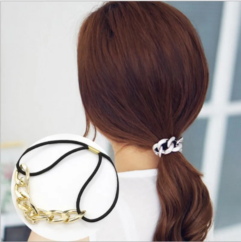 Описание: веревки для женских головных уборов Симпатичный головной убор для волос для девочек 100% новый товар высокого качества Материал: шпильки из сплава Цвет: золотой, серебряный Посылка включает в себя: 1 шт. резинка для волос